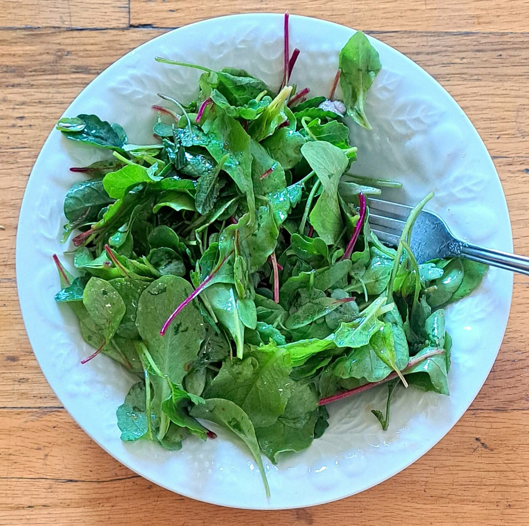 Thanks to an abnormally mild fall this year, my little garden has really thrived. Starting with the three-week-old thinnings, it has provided delicious salads every week.