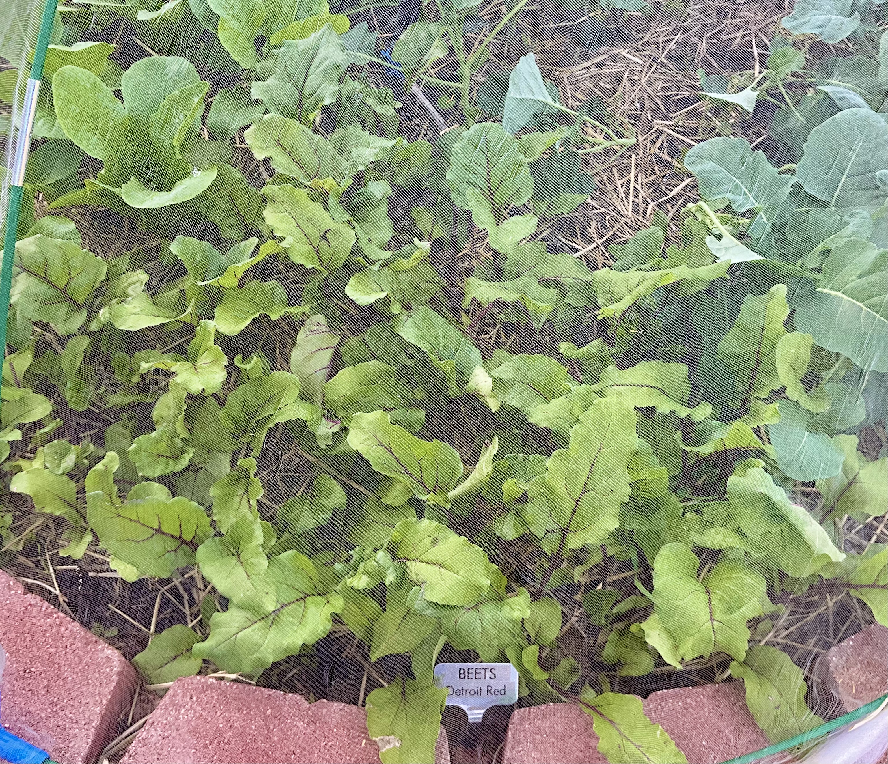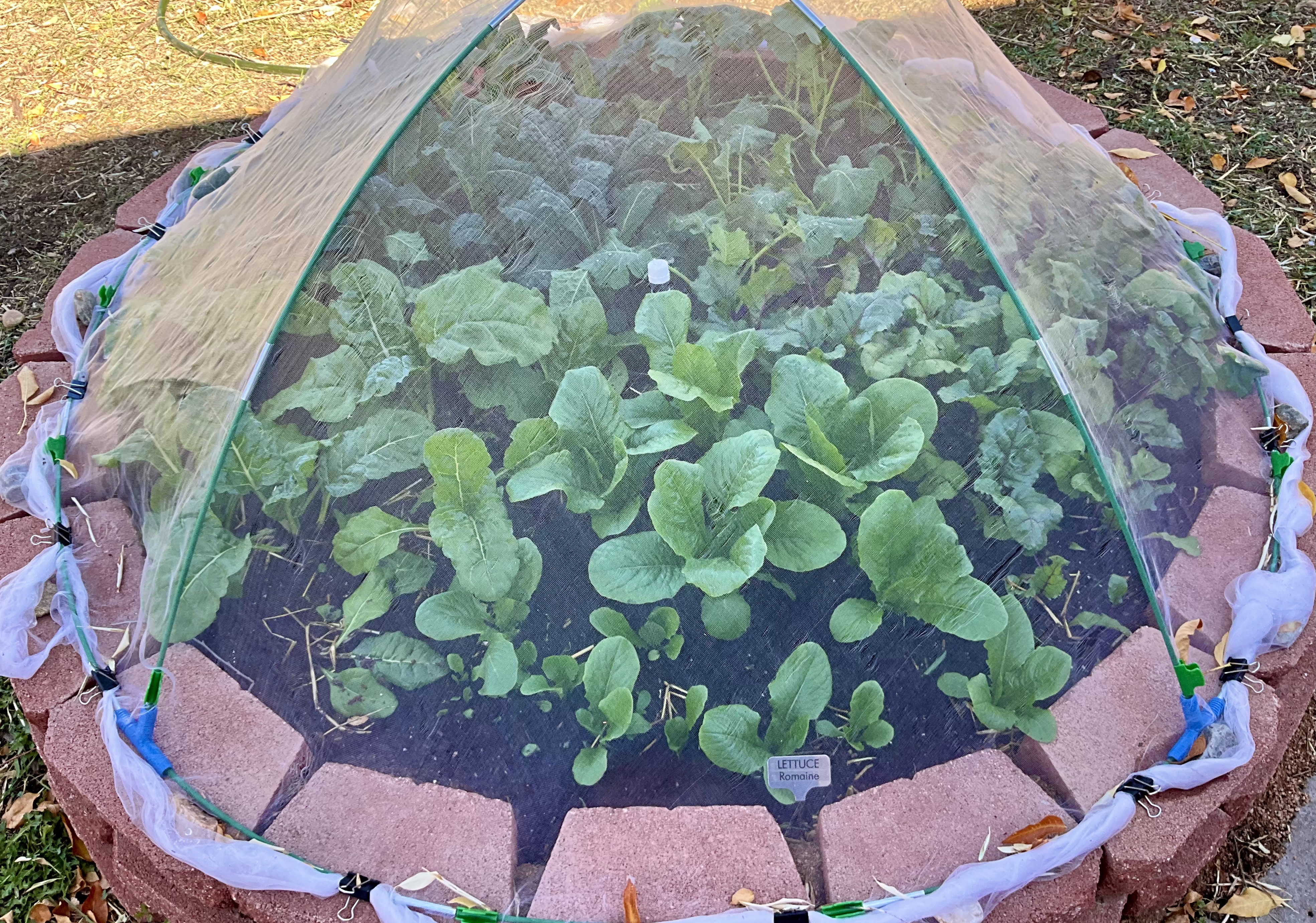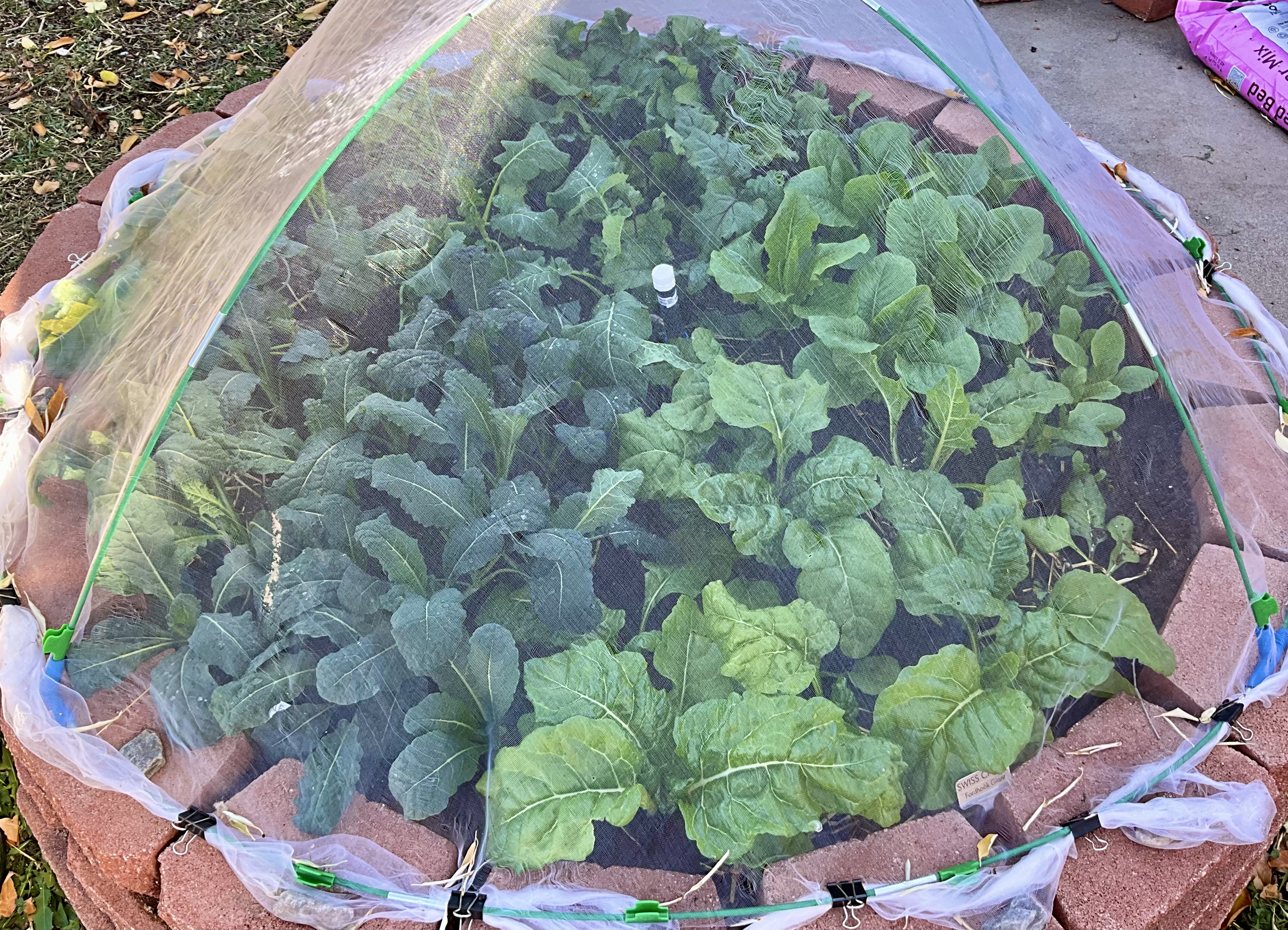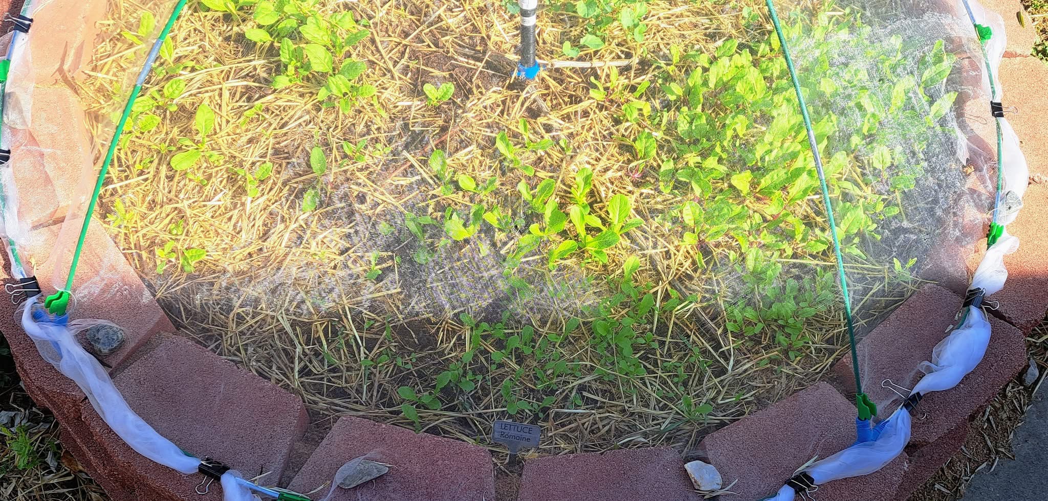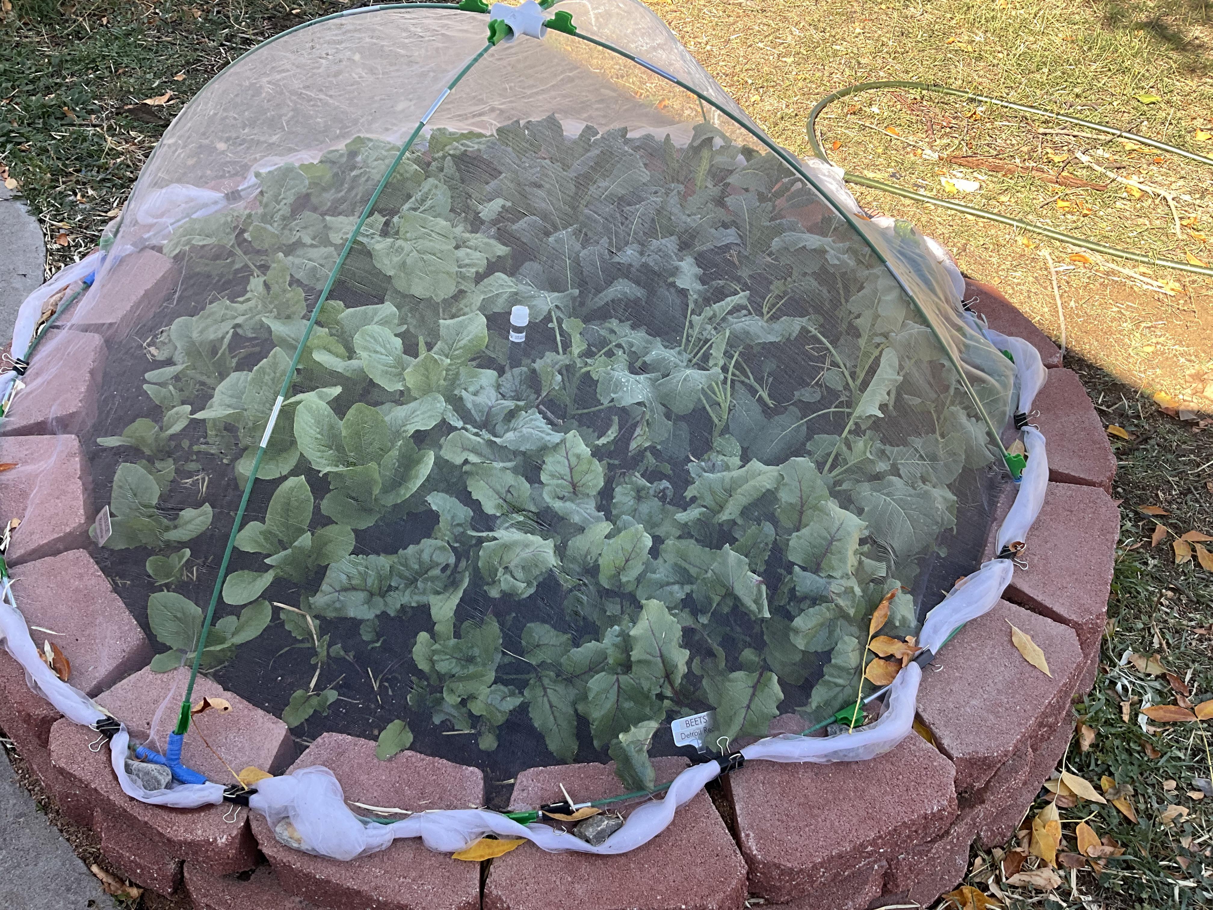 I planted some cool-weather greens as placeholders, and made a little mesh tent to keep the birds from eating the seedlings.