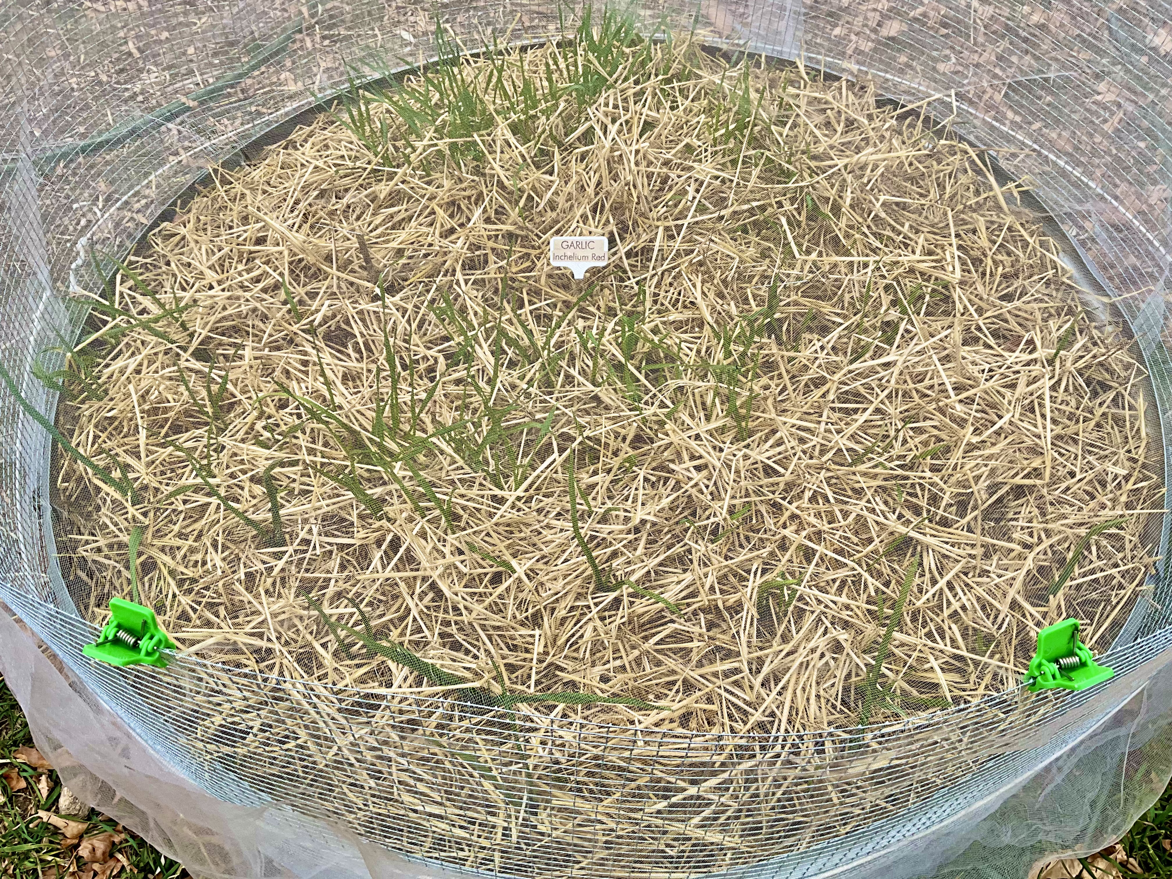 In mid-September I ordered some garlic, with the vague intention of planting it in the enriched soil that the deceased blackberry plants had vacated. Once it arrived, I realized that spot doesn’t get nearly enough light for garlic, so I ordered a cheap 4-foot round galvanized garden ring for a temporary raised bed until I figure something else out. For $20 I was expecting the metal ring to be flimsy and basically single-use, but I was pleasantly surprised when it arrived. It seems as sturdy and durable as the expensive ones you see in garden nurseries. I planted softneck garlic in one half…