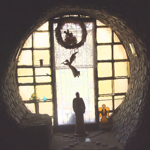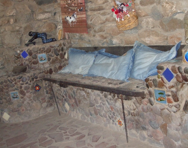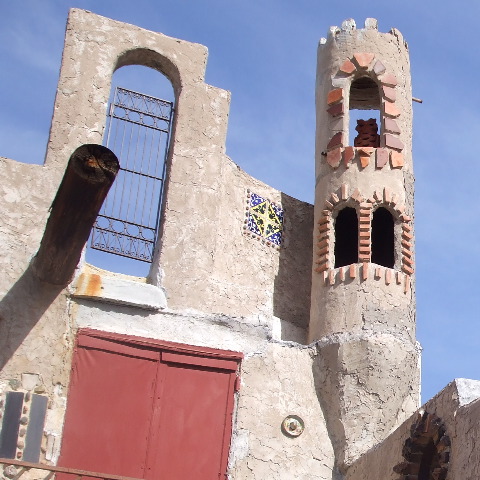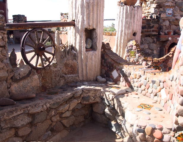 The Mystery Castle is at the center of a tale of woe and whimsy. Apparently in 1930 a man named Boyce Gulley found out that he had terminal tuberculosis. He reacted to this news by abandoning his wife and toddler daughter Mary Lou, running away to Phoenix, and building a castle there for the child he’d left behind. Not being a wealthy man, he chose a site near the town dump and built his castle out of whatever he could salvage: bits of cars and wagons, discarded bricks and blocks and stones, old bottles, you name it and he used it.