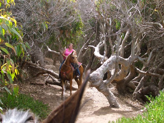 The first day we were there, Mahogany wanted nothing to do with the ocean. On the second day I coaxed her into at least walking in wet sand. This was big progress for my water-phobic mare, but she forfeited her brownie points later in the day when I had to dismount and lead her across a tiny little creek back in the hills. Actually she leaped over the creek and landed practically on top of me. No cookie for her!
