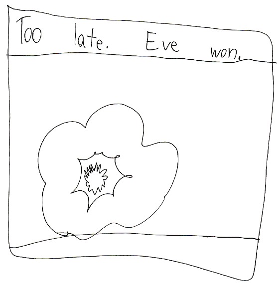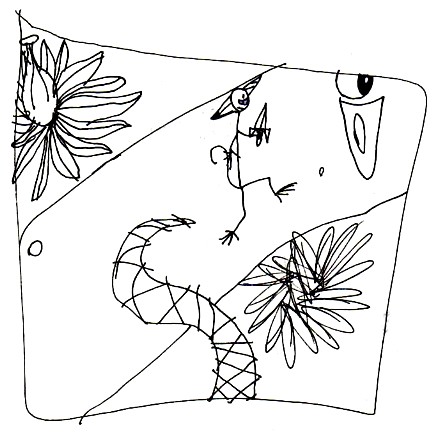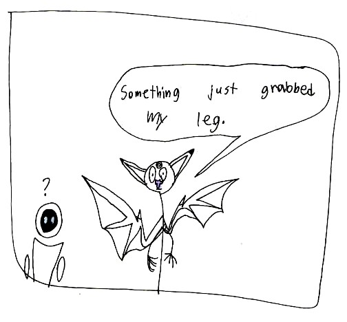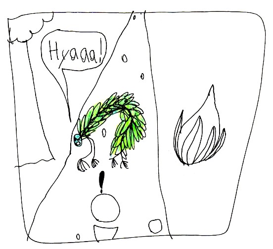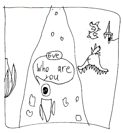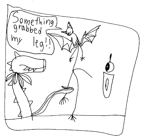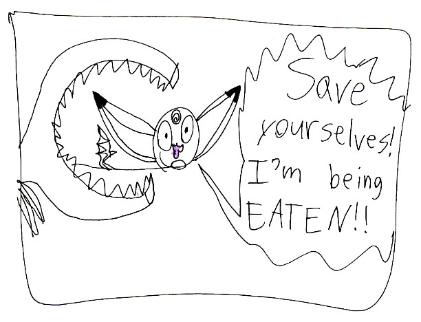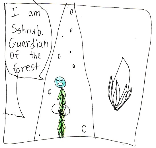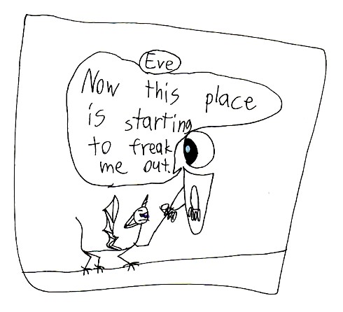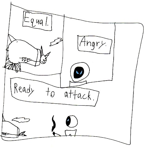 The second thing that might need an explanation is Elizabeth’s habit of indiscriminately co-opting other artists’ characters into her own universe. She doesn’t see anything incongruous in drawing a story that contains, say, Calvin (from the Calvin and Hobbes strip), Otto Mattic (from a favorite computer game), and Buizel (the Pokemon critter) interacting with one another.