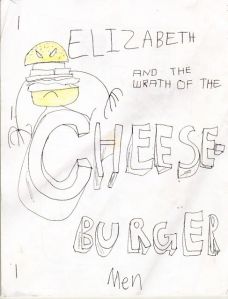 Elizabeth has been wrapped up in schoolwork and other projects this week, so she hasn’t been drawing much. I asked her if she had anything for Sampler Saturday and she handed me an odd little story titled “Elizabeth And The Wrath Of The Cheeseburger Men,” which sadly was neither coherent enough nor visually striking enough to post. Except the cover, which was kind of cool: