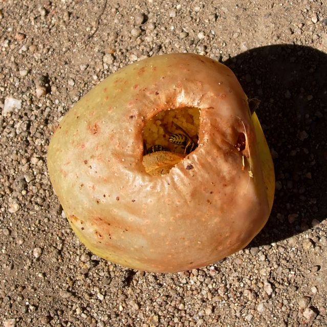 It’s an apple that’s been completely hollowed out by wasps; there’s nothing left but the core, the translucent skin and some odd little granules. I think it’s sorta pretty.