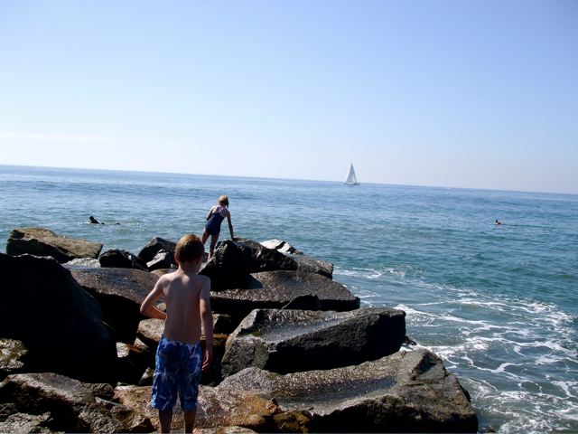 Friday was gorgeously sunny and warm so we got together with two other moms and six other kids and took a trip down to Oceanside. Luke had never been to the beach before and Elizabeth hadn’t been since she was a toddler, so this was effectively a first for both of them.
