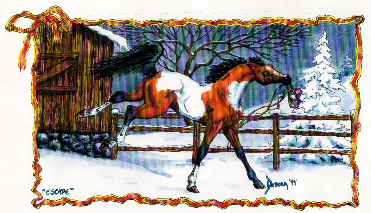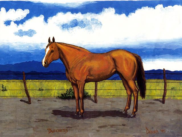 Duchess was the horse Steve was riding at the time, before he got Sam. I gave him the original painting for Christmas that year, and printed some smaller copies onto Christmas cards for him and his family.