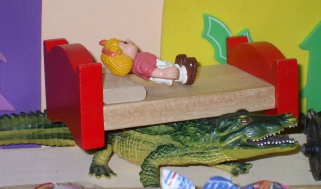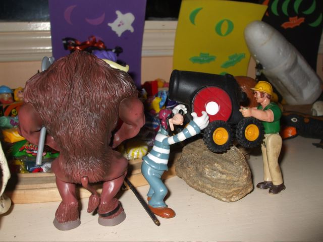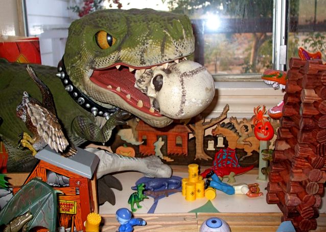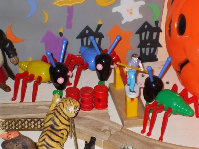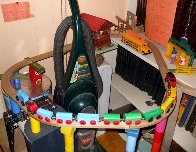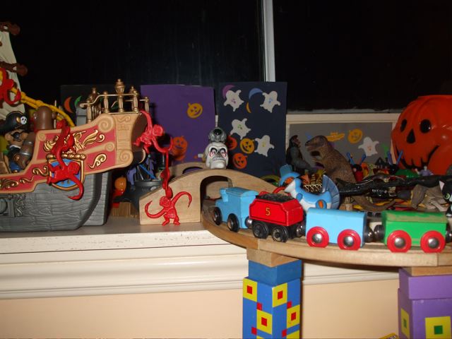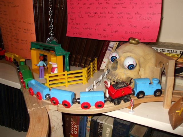 Elizabeth built a “haunted train ride” so her toys could have something fun and spooky to do for Halloween. It ended up sprawling across two bookshelves, the entire window seat and the dining-room hutch. It’s too big to show all of it — the page would take forever to load — but here are my favorite parts (click on any image for a slightly larger version):