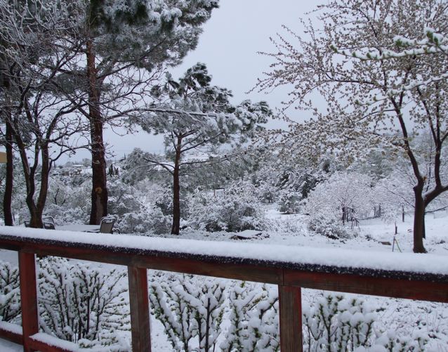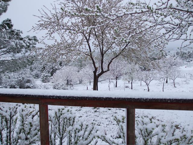I suspect I’ll be replacing all the tomato, bell pepper and eggplant seedlings that I planted last week in a fit of optimism. Yesterday afternoon I covered them with upside-down clay pots and spanish tiles and stuff, thinking we might get a frost, but today’s forecast says more snow and I don’t think my little clay pots are going to be enough to save them.