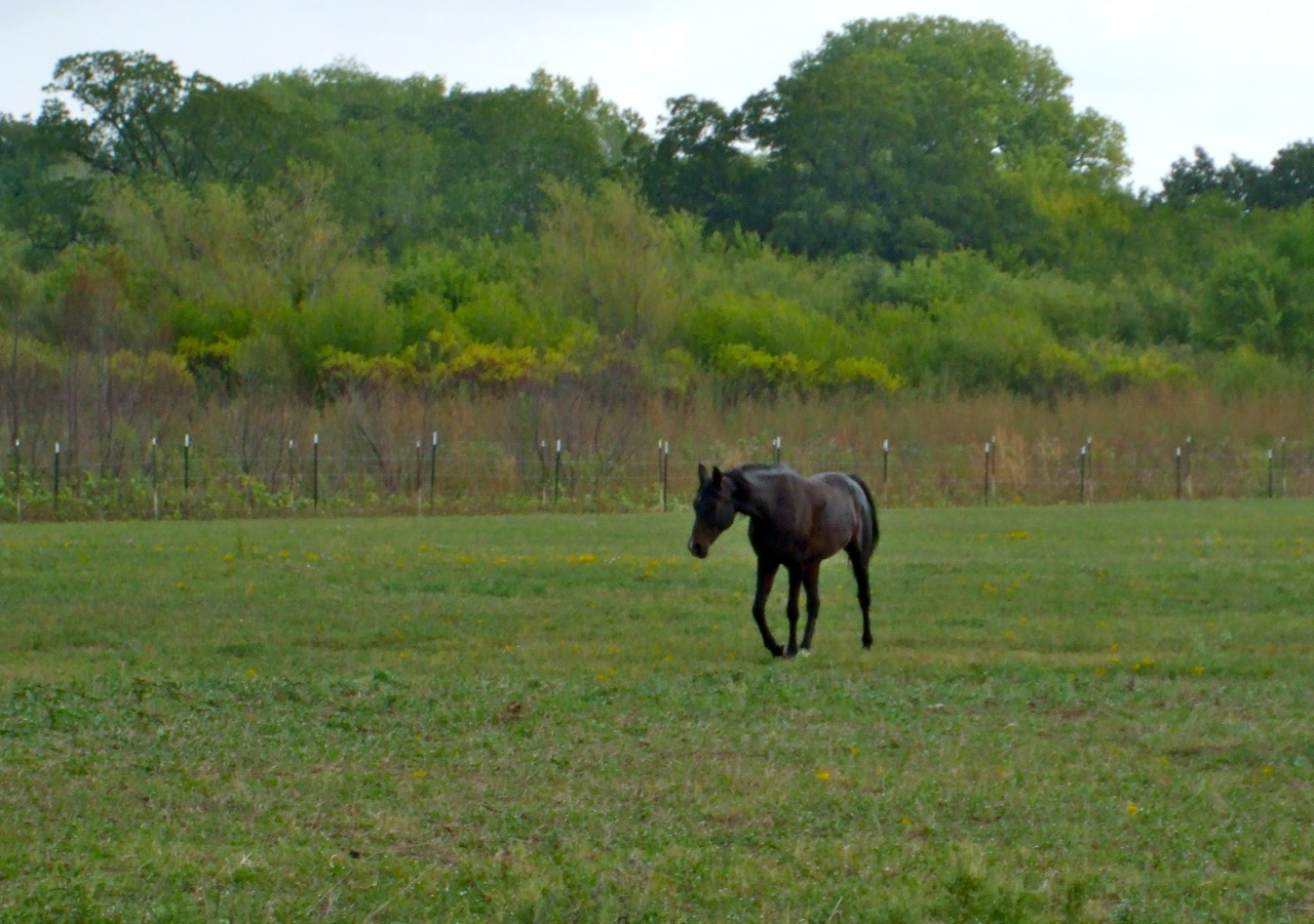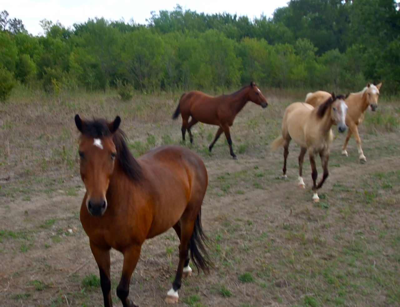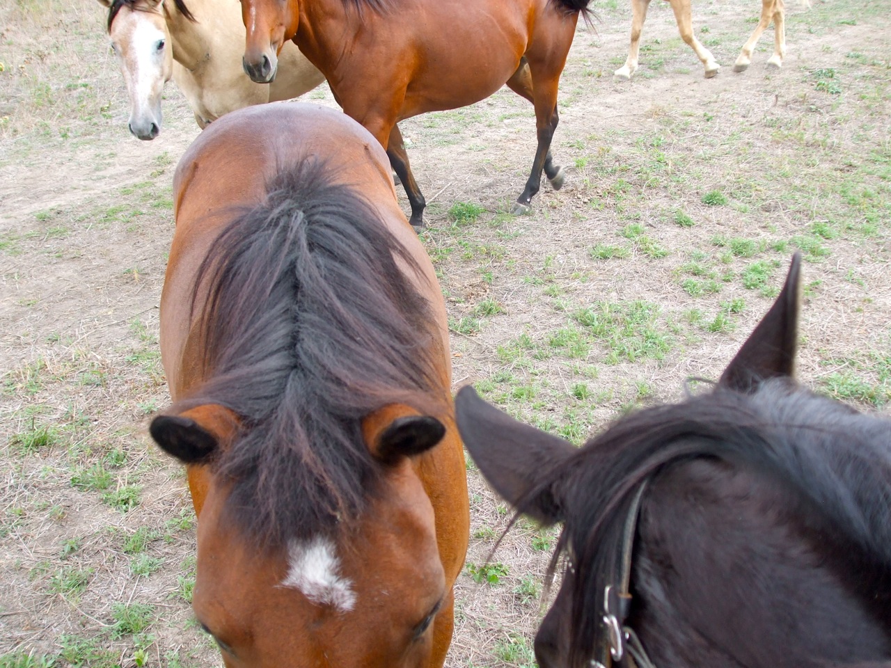 Oddly enough, Mahogany wanted nothing to do with them. She just wanted to get back to her own buddies in her own pasture. I shooed the strange horses off, and they left us alone.