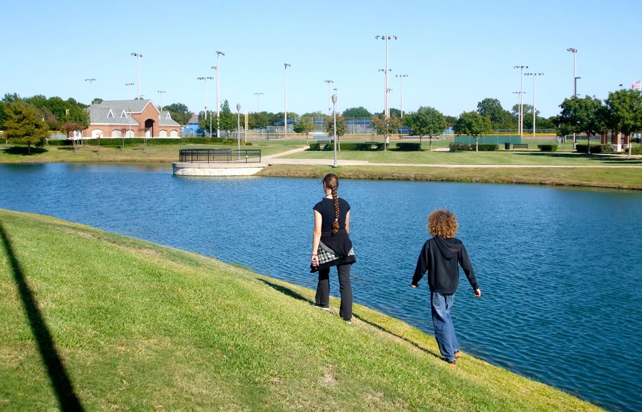 We were walking around the pond and I saw what looked like the body of a dead snake in the grass. The scene went something like, “Oh look, a snake! Oh, it’s dead. Is it dead? It looks dead.” [Nudge snake with toe of shoe, snake doesn’t move.] “No, it’s dead. It — holy crap, it’s moving!” [Fumble for camera as disgruntled snake heaves irritable sigh and slithers into the water.]