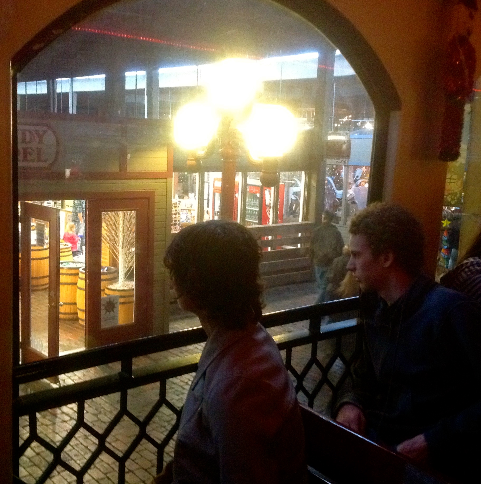 …while Luke and I found a comfy perch on a wall behind the crowd.