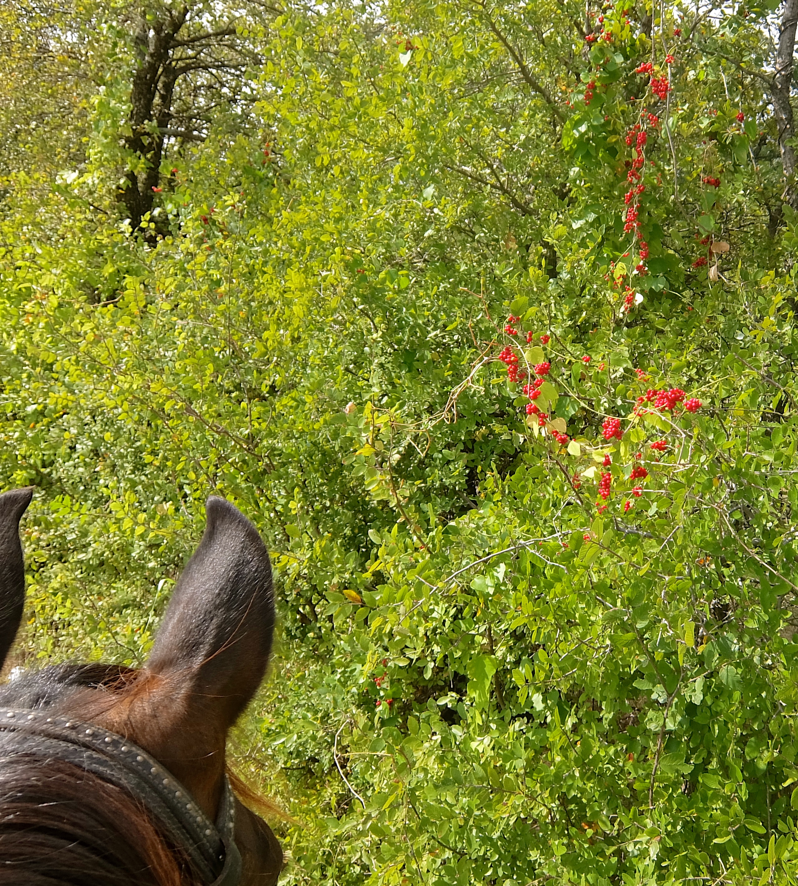 I got a whiff of fall in the air on this morning’s ride. Little signs are everywhere: ripe berries along the roadside, leaves starting to turn. Mahogany is darkening as her winter coat begins to replace the sunburned summer coat.