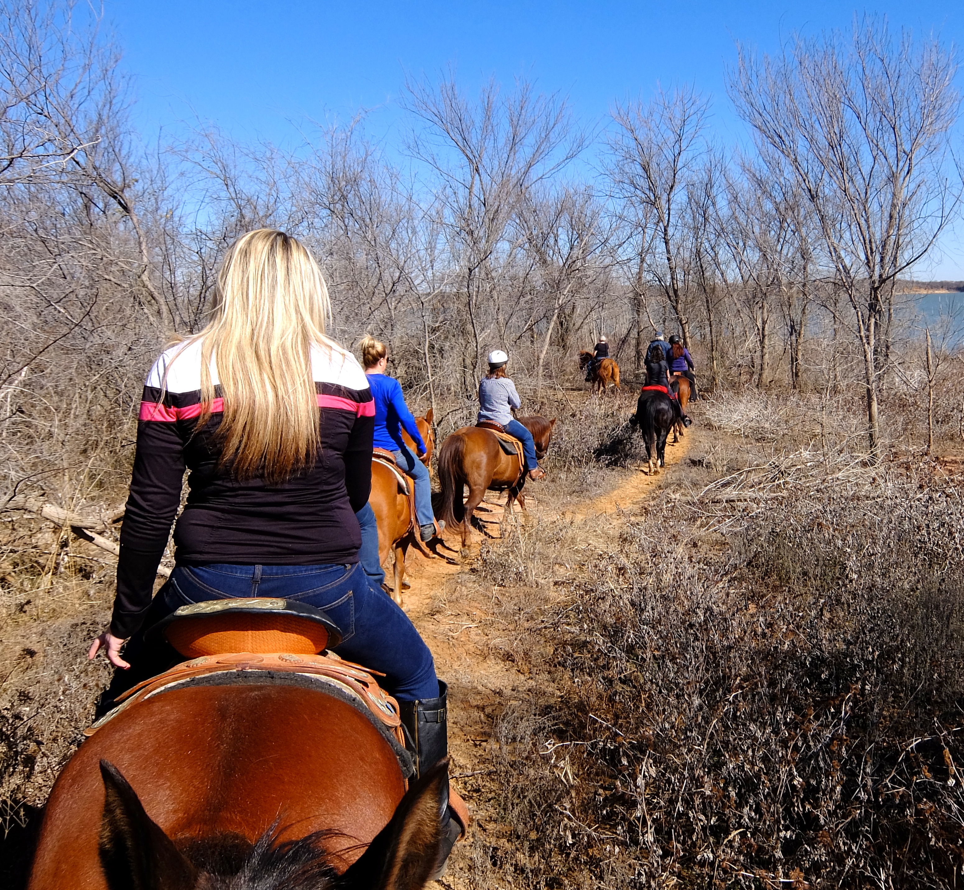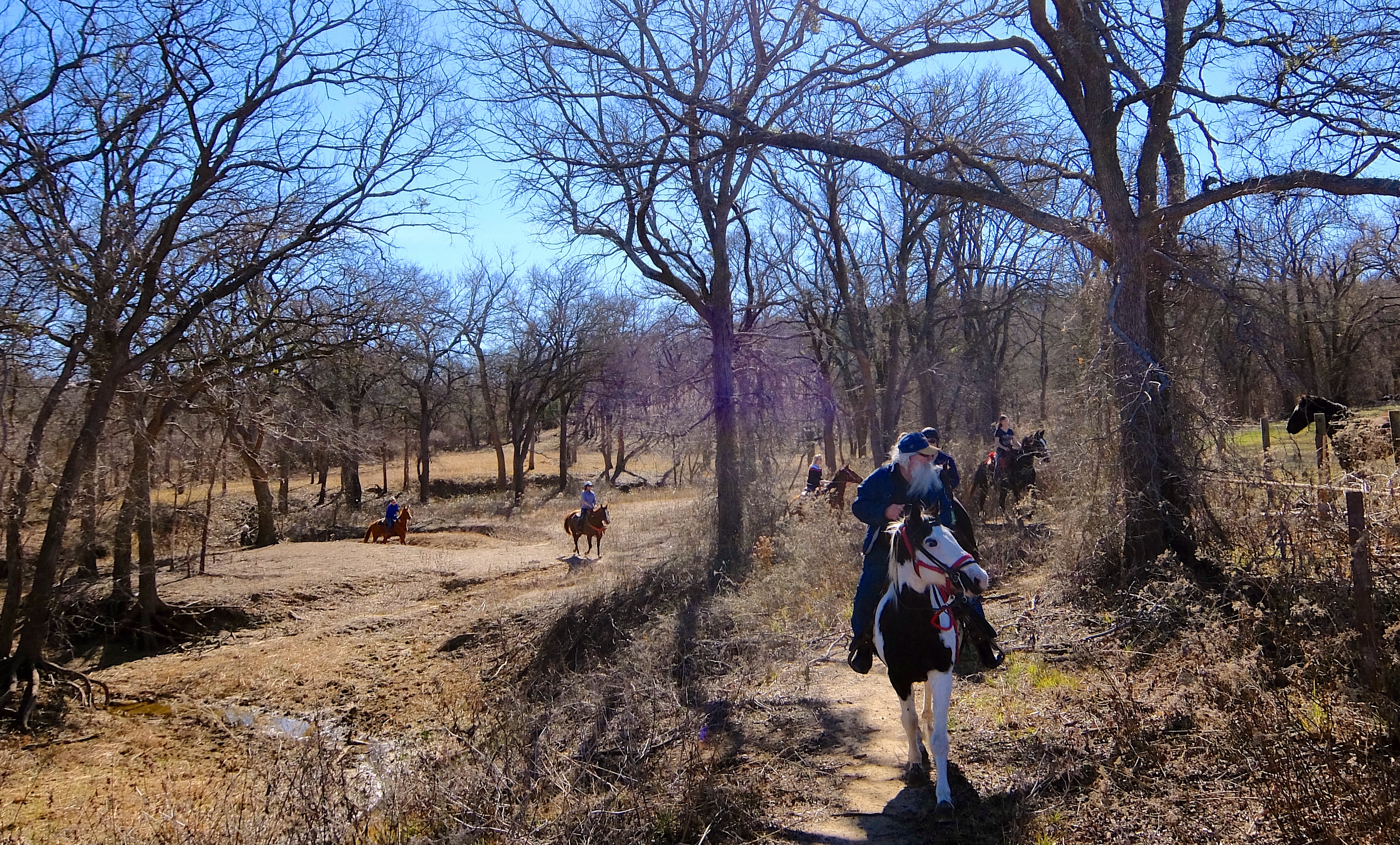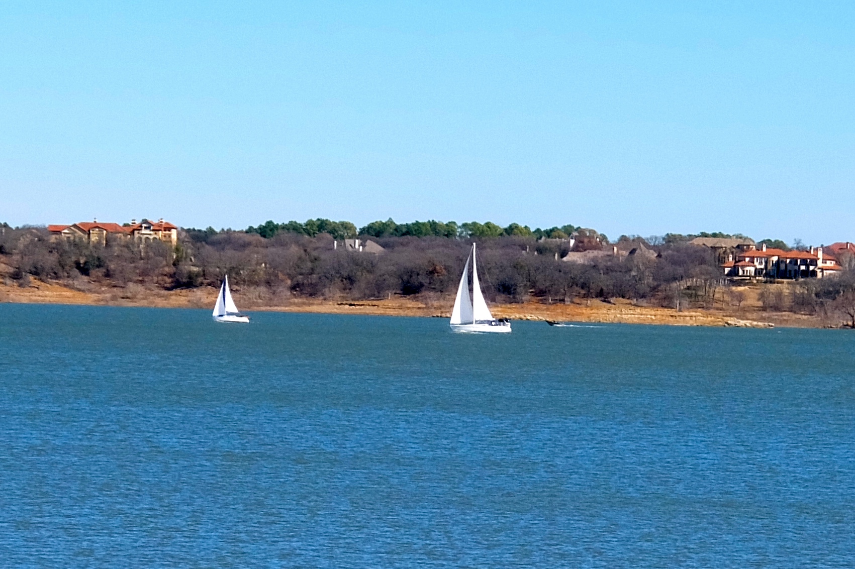 This time I used my Professional’s Choice saddle pad, which puts a solid inch and a half of high-density foam between the treeless saddle (and my butt) and Mahogany’s spine and withers. It also has a cut-out over her withers, so there is no pressure on them. It was very comfortable for both of us, but almost comically oversized for the saddle. Here is a picture of me taking a picture of sailboats on Grapevine Lake, in which you can see the pad and the saddle .