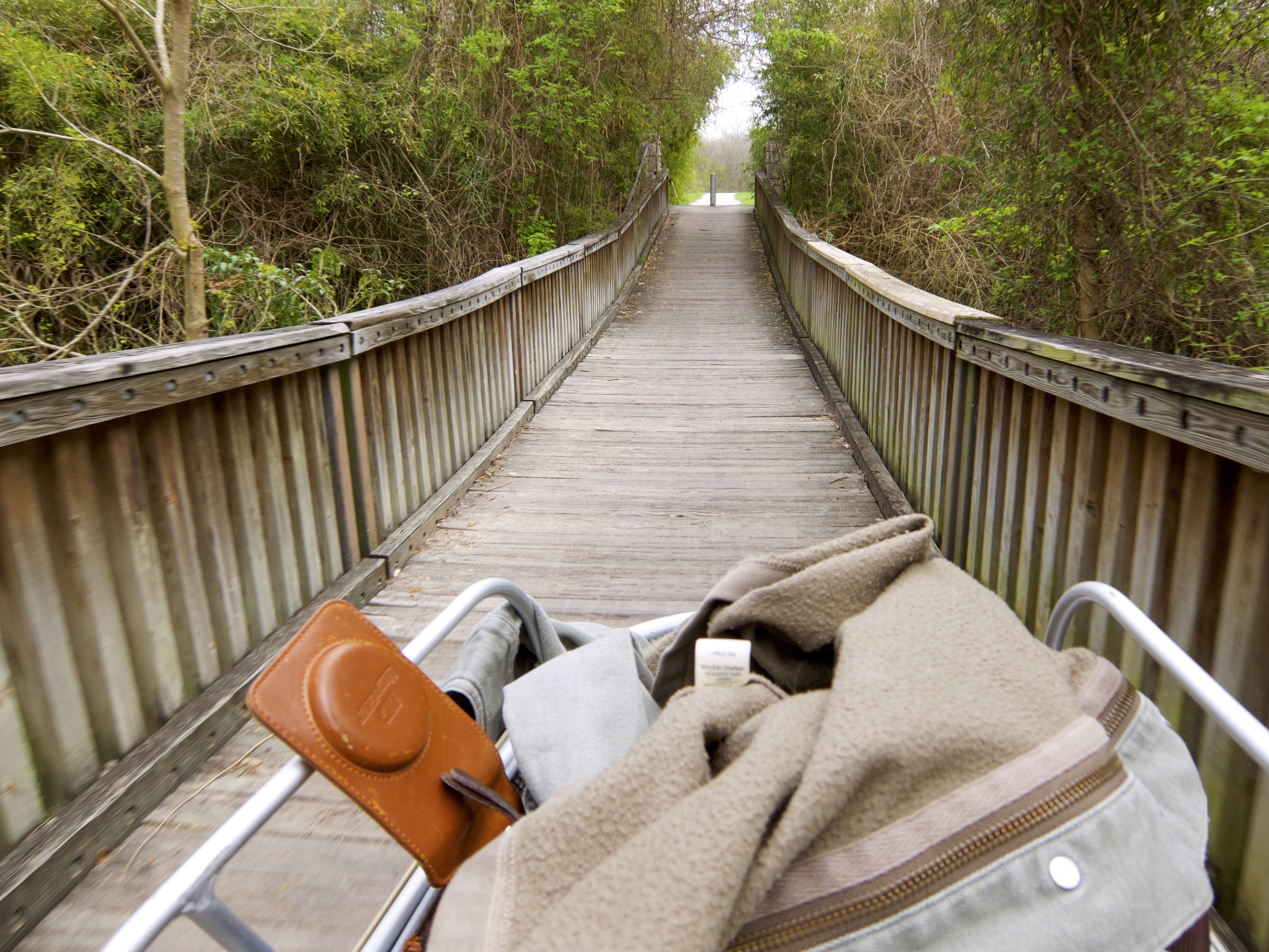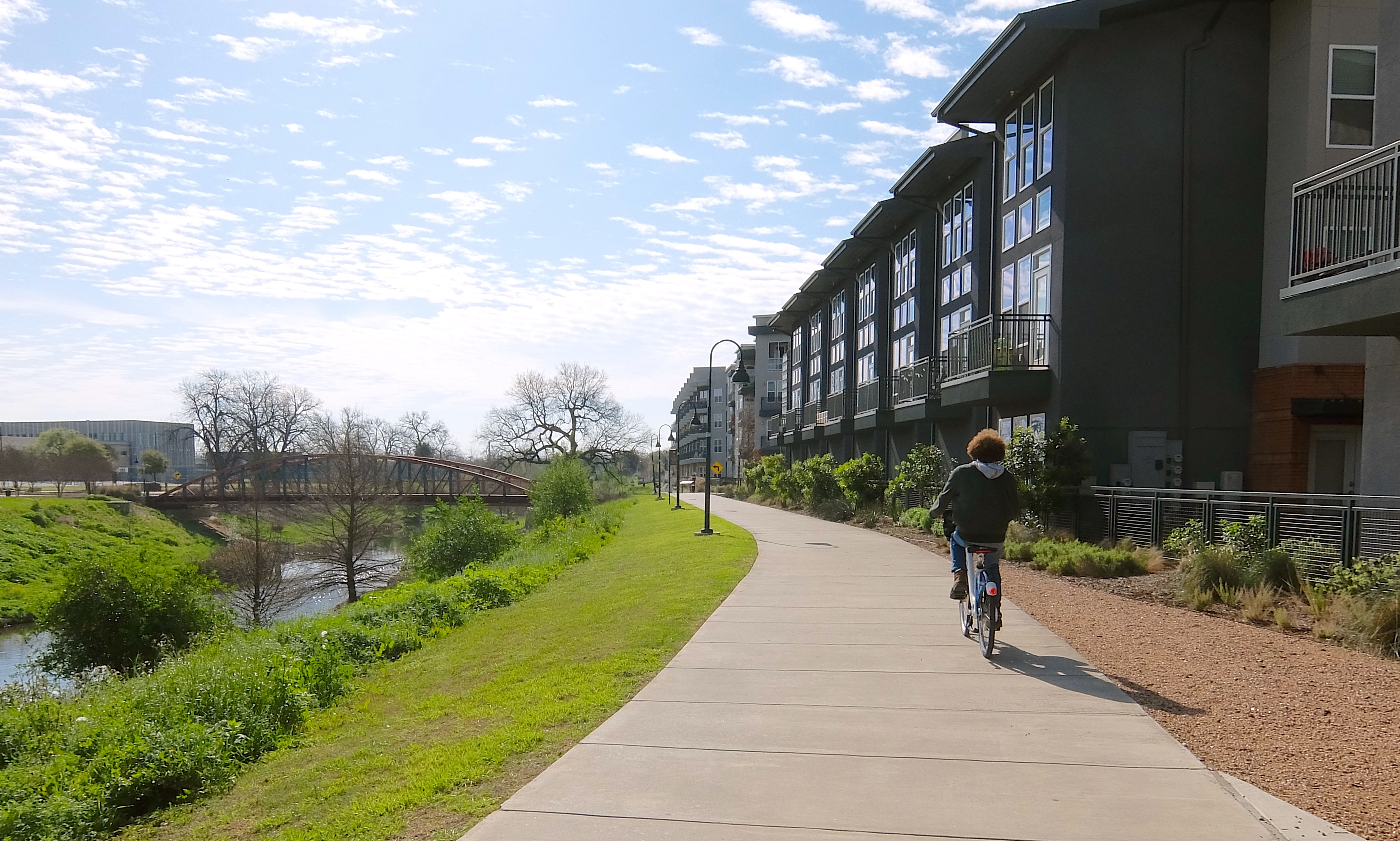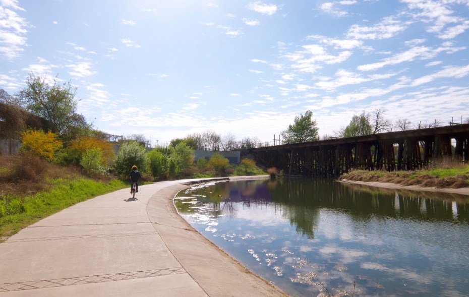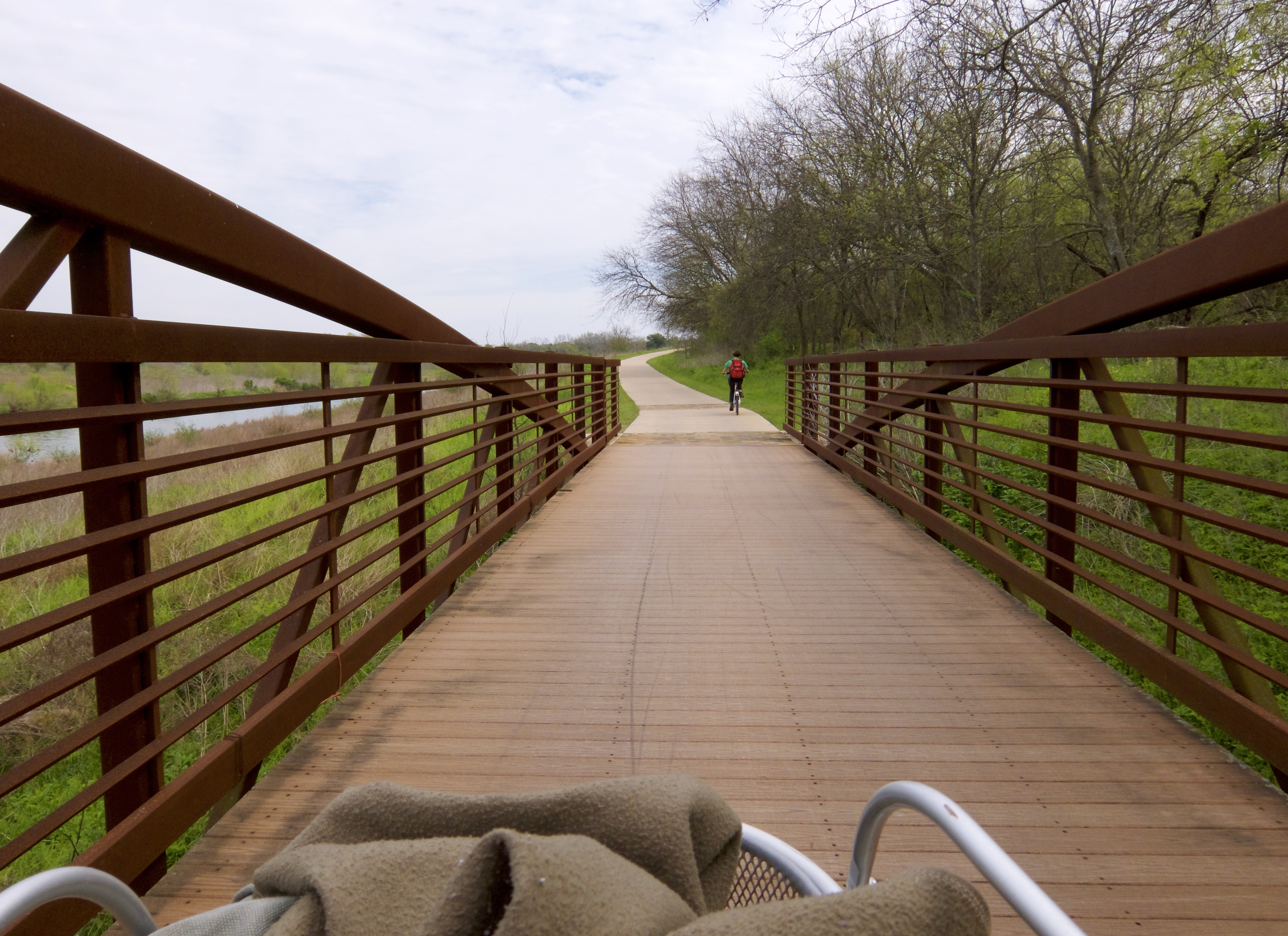 There’s no hike-and-bike trail between the Pearl and the bridge, but there are mostly continuous bike lanes on the streets. We got there with no problems.