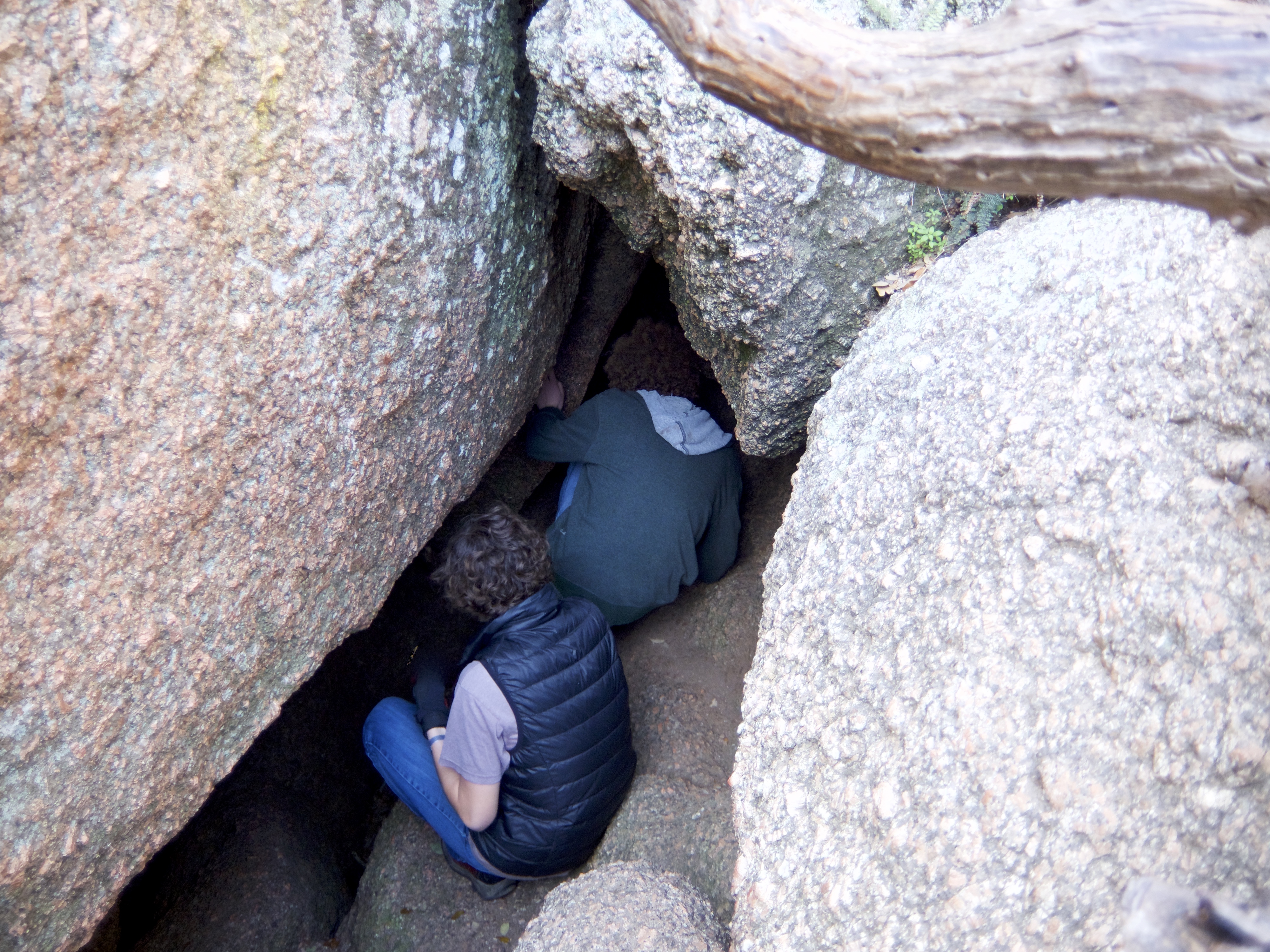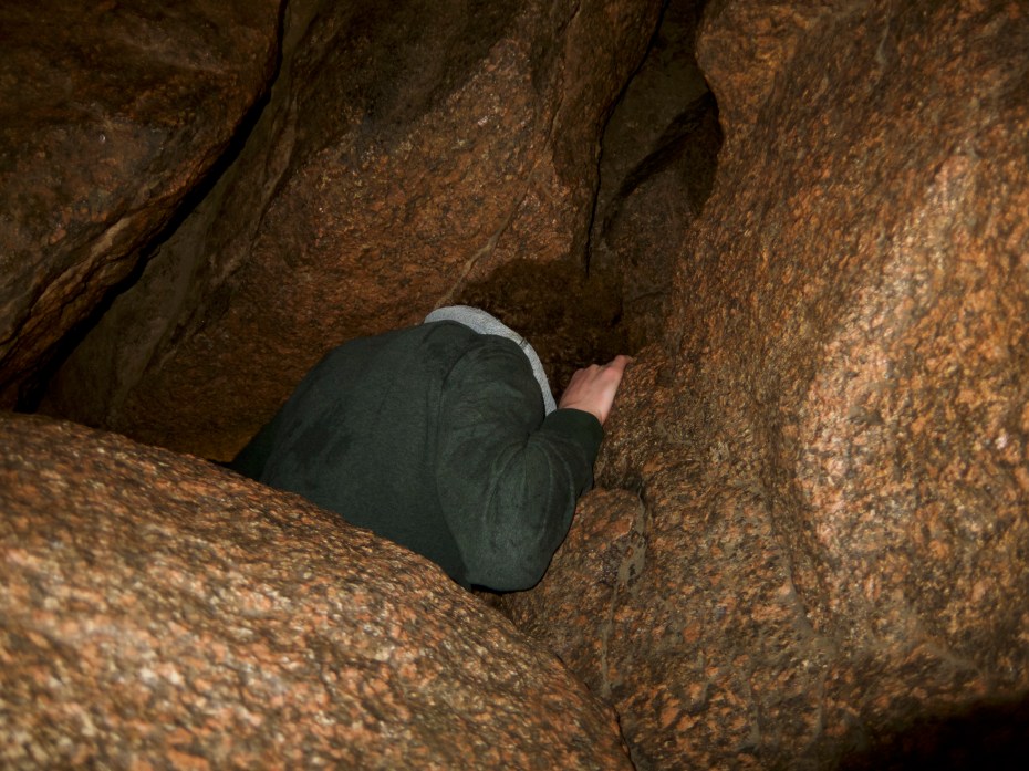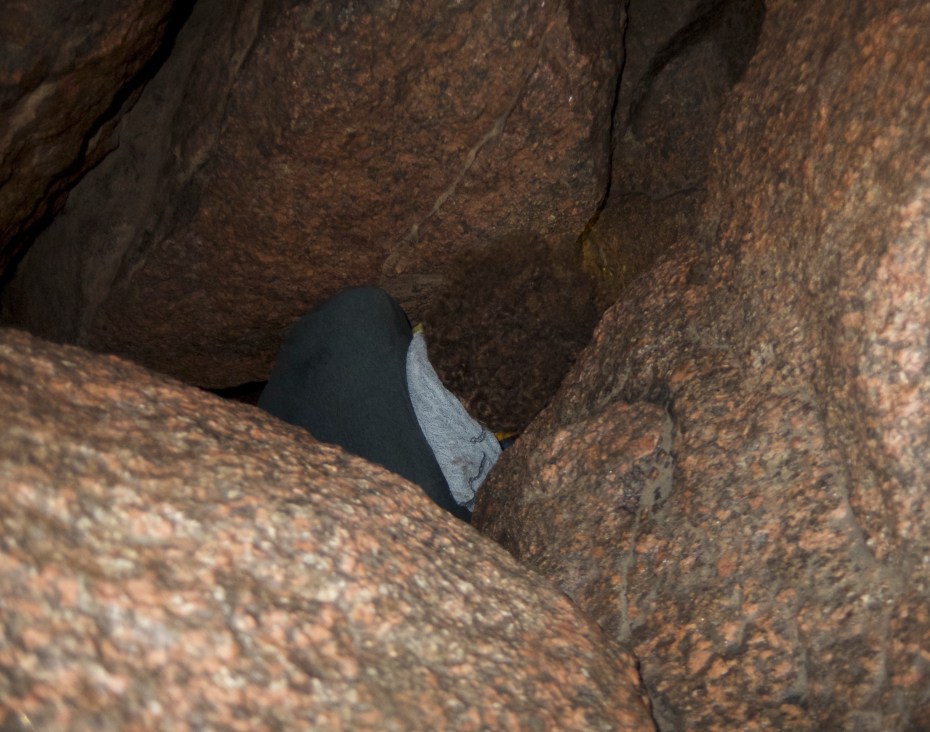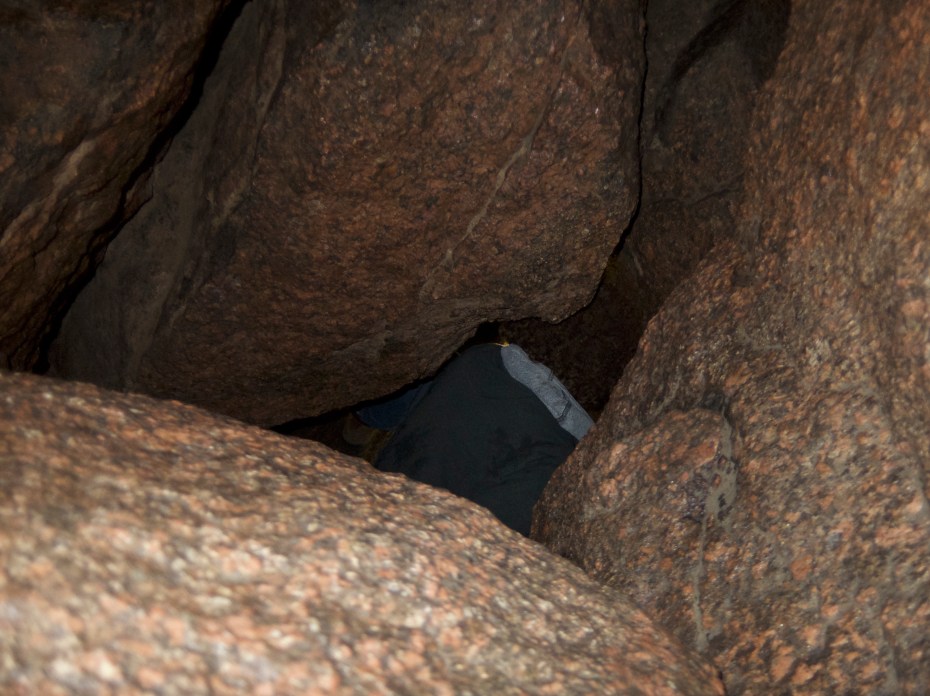 There’s a cave entrance near the summit with an exit about halfway down the back face. I guess you could climb up through it from the other direction, but it would be harder. Even doing it downhill, the experience was more intense than I had expected. Here is the entrance: