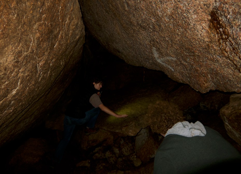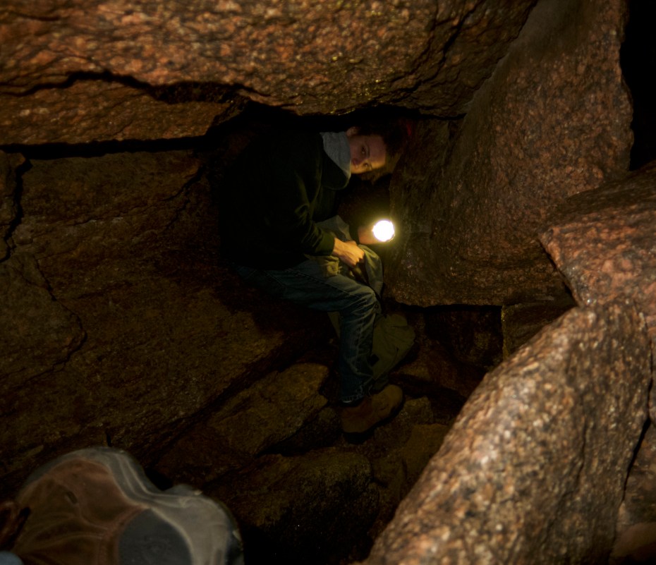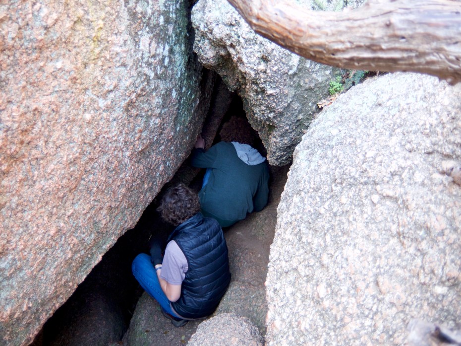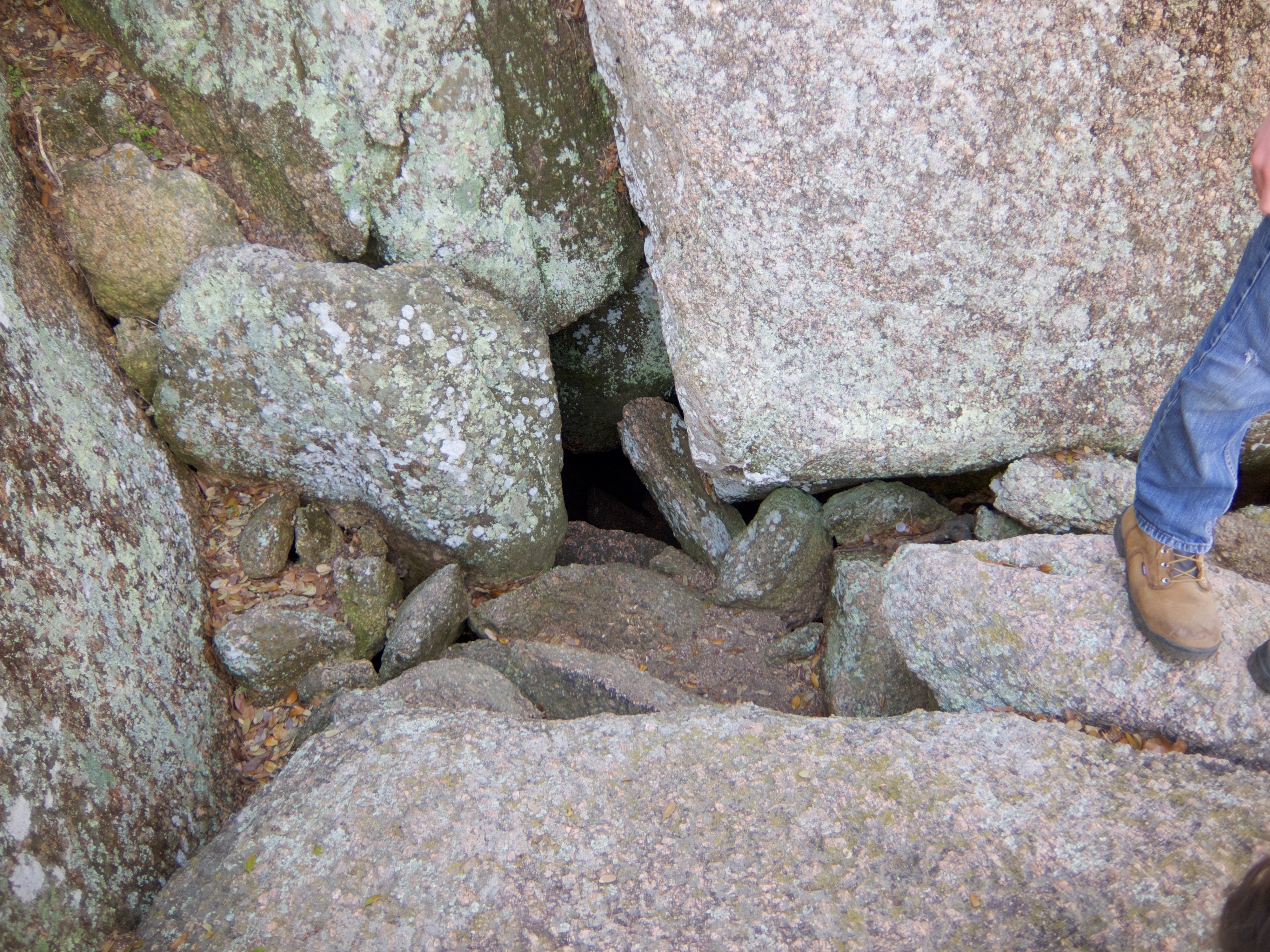 There’s a cave entrance near the summit with an exit about halfway down the back face. I guess you could climb up through it from the other direction, but it would be harder. Even doing it downhill, the experience was more intense than I had expected. Here is the entrance: