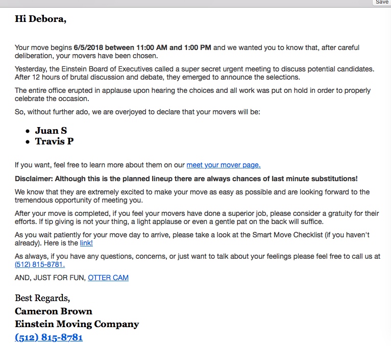 I’m not going to list the people who helped us, because a decade of blogging has taught me that there’s a baffling number of misanthropes out there who have nothing better to do than harass people who are identified on the Internet. But I’ll happily recommend A+ Apartment Locators to anyone looking for help finding the right Austin apartment. And a big shoutout to Einstein Moving Company as well. We hadn’t planned to use a moving company, but packing and loading up the U-Haul was more of an ordeal than we expected. So many books. So much solid oak furniture that should not live in an upstairs apartment. So many trips up and down stairs. Getting my oversized front-loading washer down the stairs almost did me in, and the thought of dragging it up another set of stairs in the Austin heat made me want to weep. So we called ahead and hired movers to unload the truck into our new apartment. A few hours after I made the reservation, I got this email: