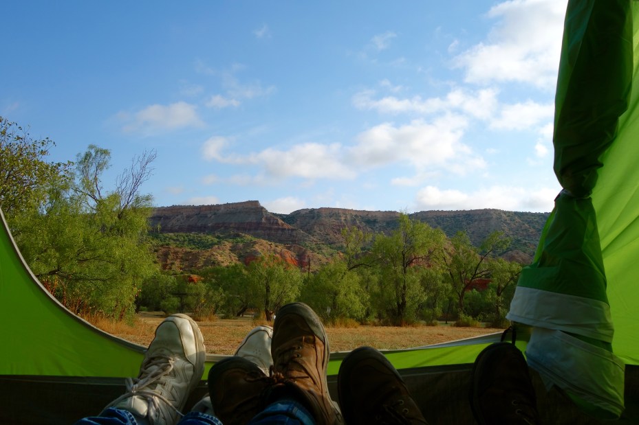 Luke and I have slipped the surly bonds of customer service and gotten regular weekday jobs, which has improved the quality of our lives by about a billion percent. Elizabeth is still working in the food industry, but she likes her current job well enough and she was able to request the Labor Day weekend off without too much trouble. When the big weekend arrived, we napped through the worst of the Friday afternoon and evening commuter traffic, and then rolled out of Austin at 12:30 a.m. Seven hours later the sun rose on a flat world of corn, cotton, cattle and graceful white wind turbines. Around 8:00 a.m. we arrived at Palo Duro Canyon State Park.