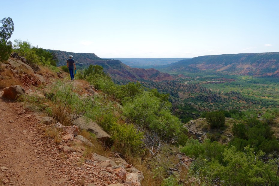 But Rock Garden Trail’s best scenery is on the way up. The vista from the top is, in our opinion, rather underwhelming. It does connect with a rim trail at the top that probably leads to better views, but by then we were running low on water and had to head back down. We still hadn’t gotten a really good look at the canyon, and we were starting to wonder if Palo Duro were overhyped.
