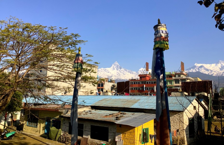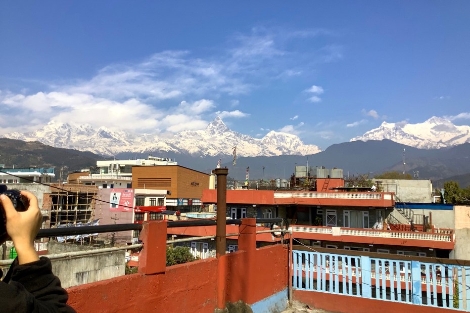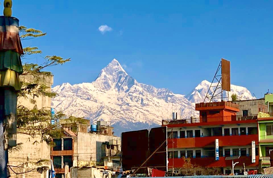 The high triangular peak is Machhapuchchhre, a sacred mountain. The Nepali government doesn’t permit anyone to climb it.