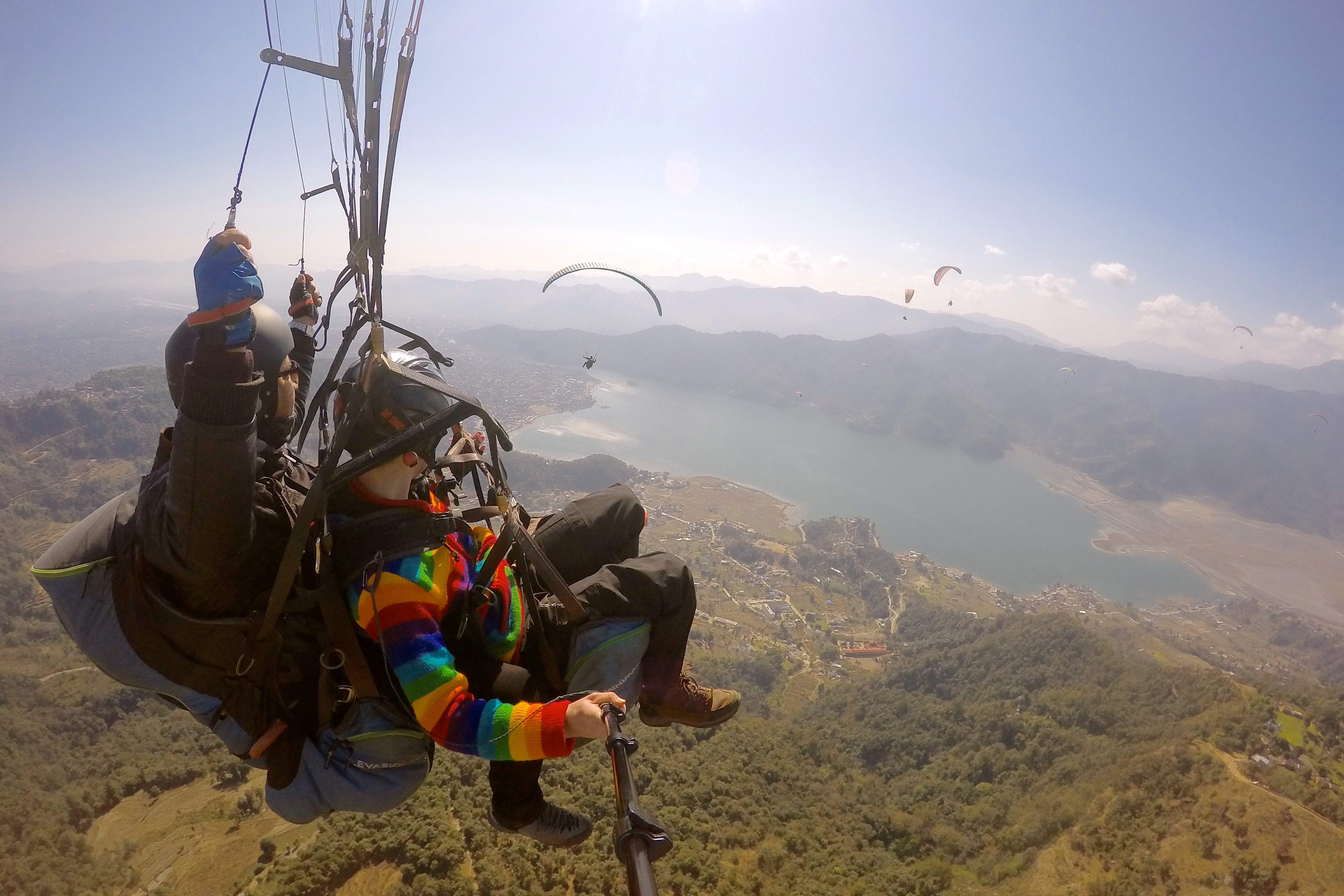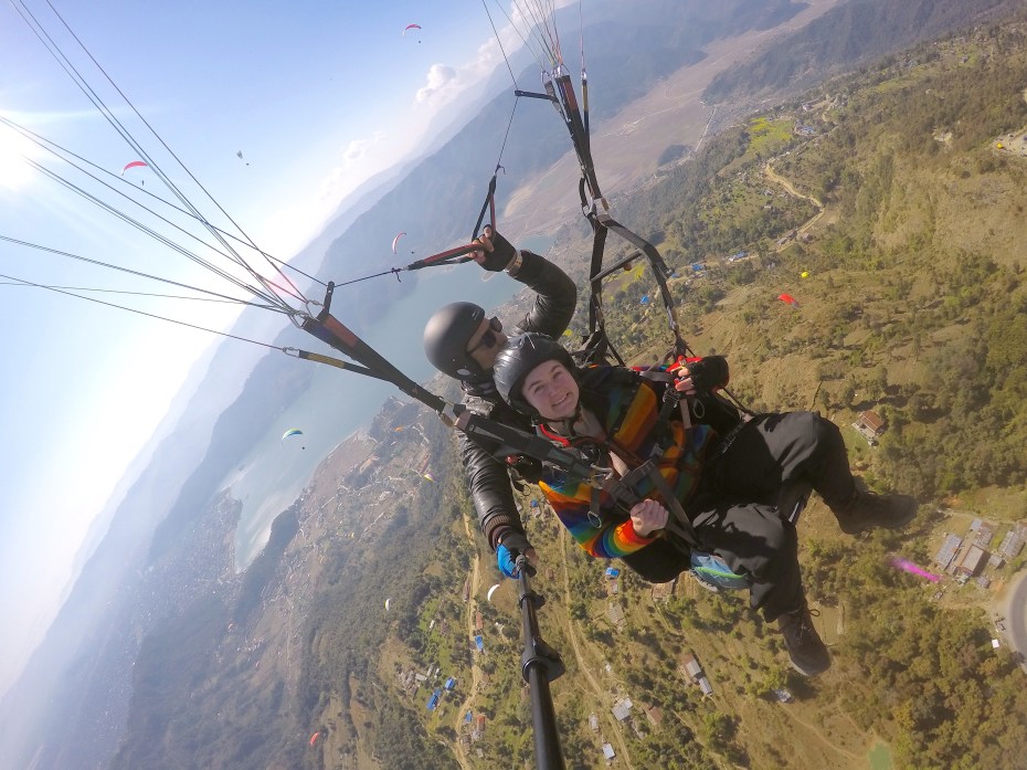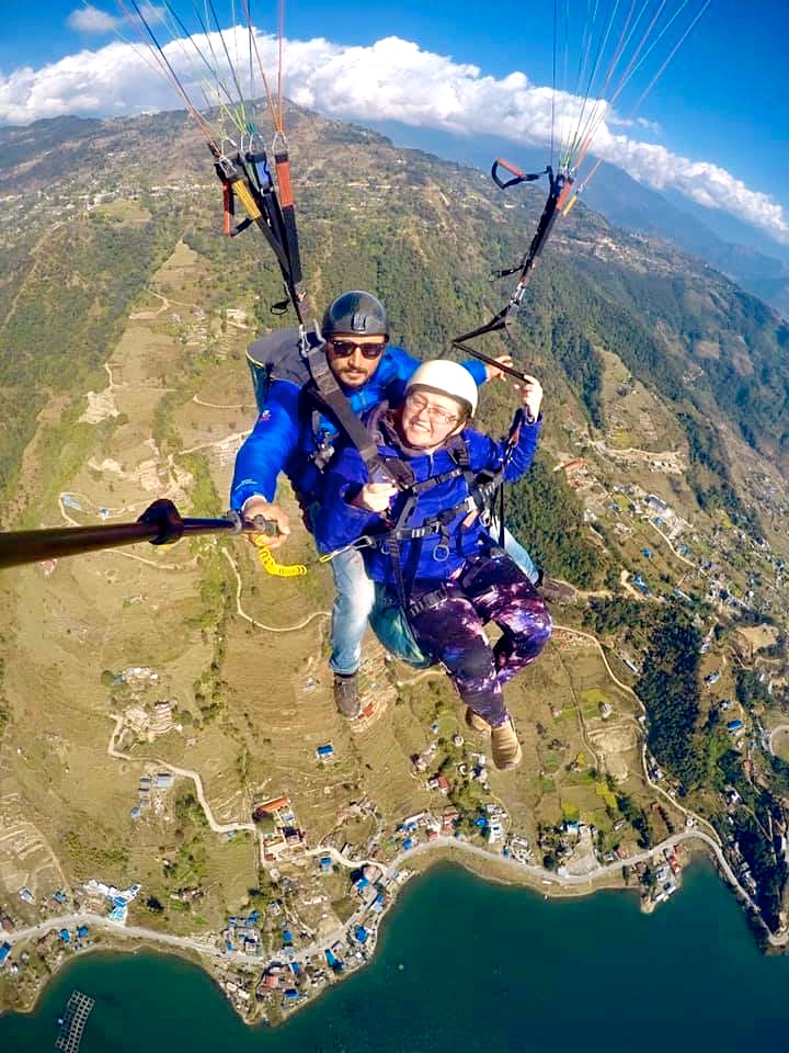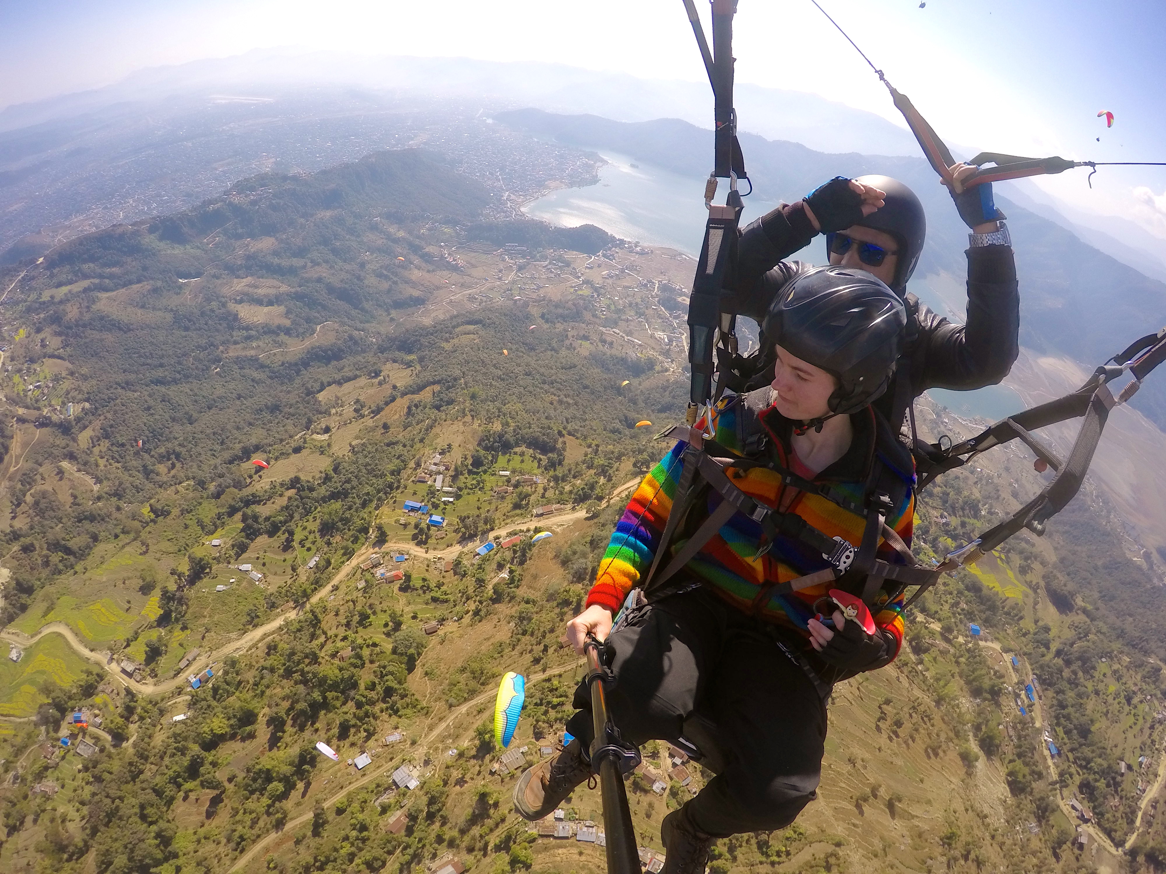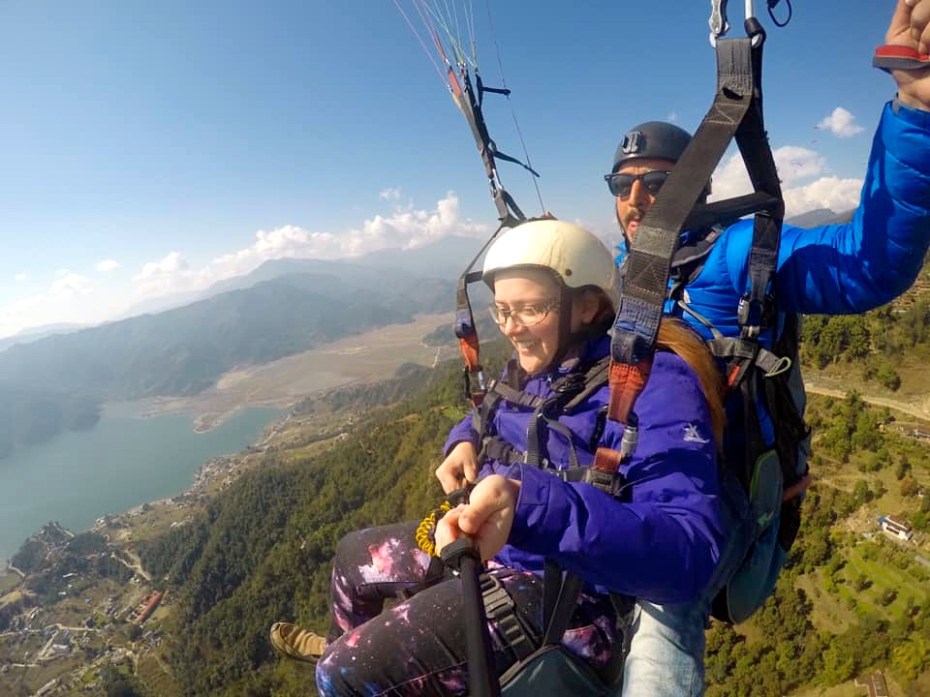 The next day, Emma and Elizabeth went paragliding over Phewa Tal.