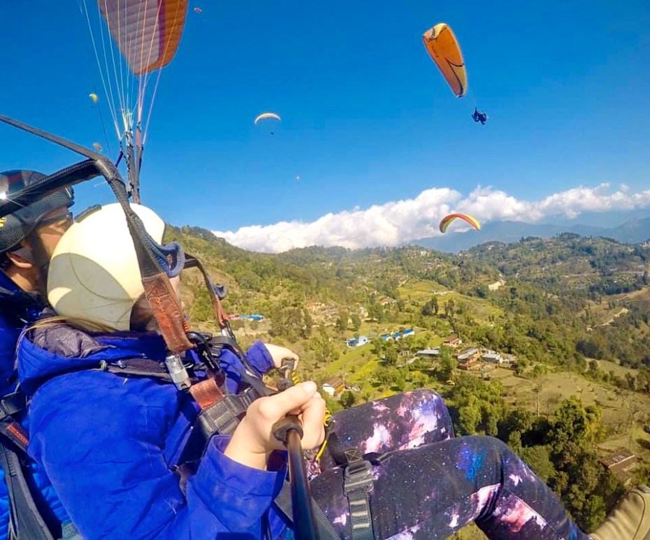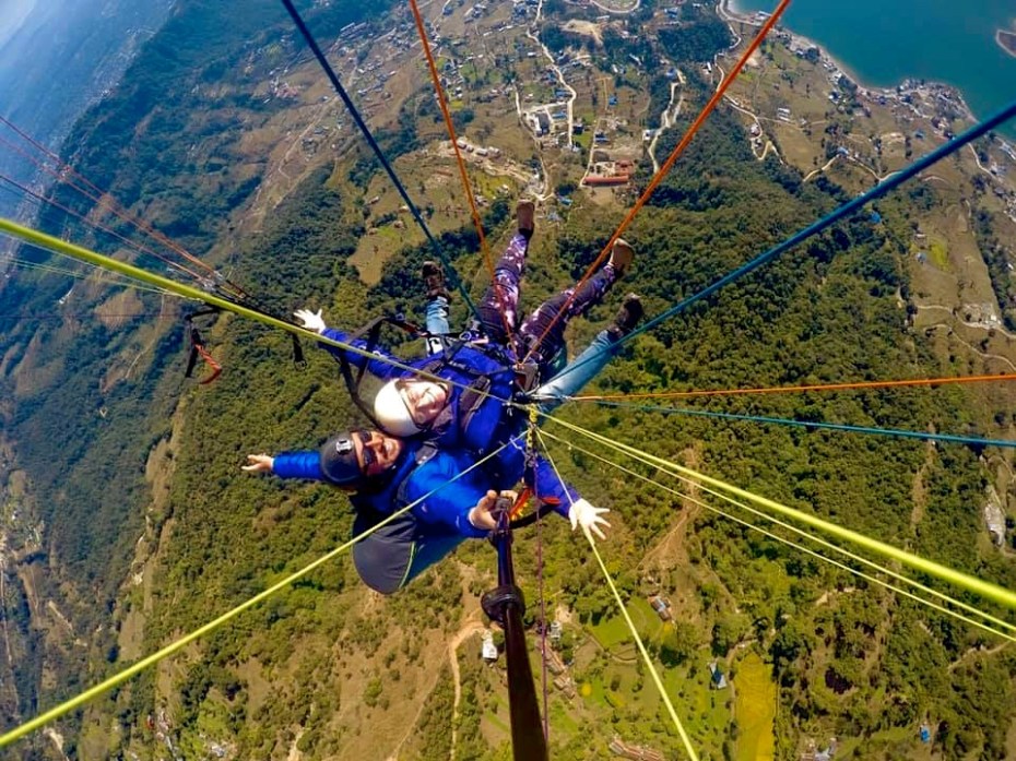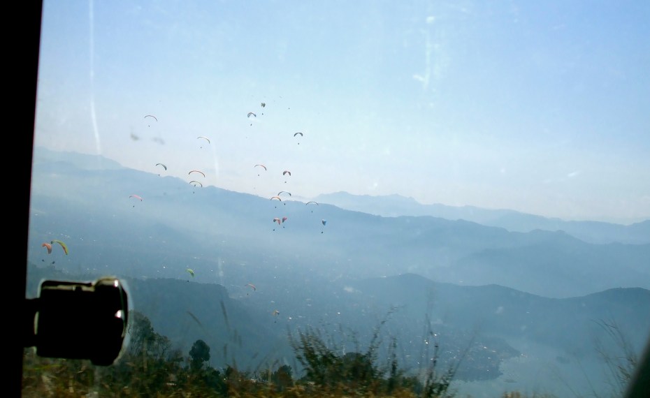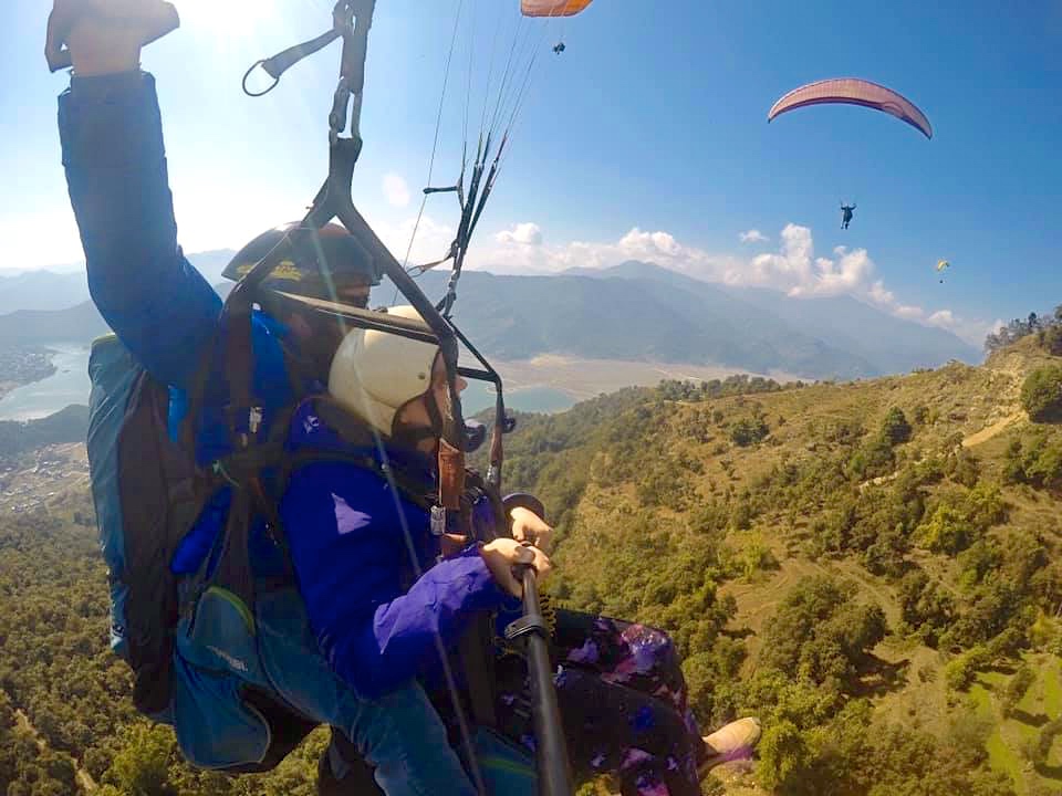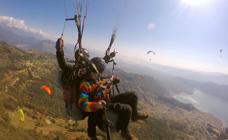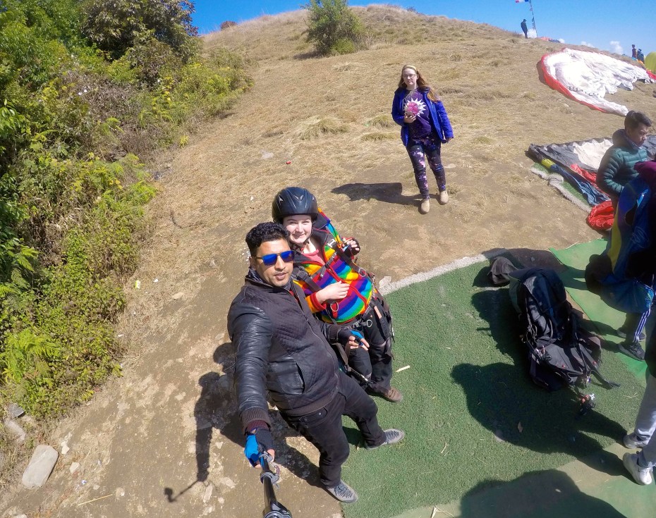 The next day, Emma and Elizabeth went paragliding over Phewa Tal.