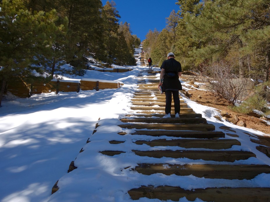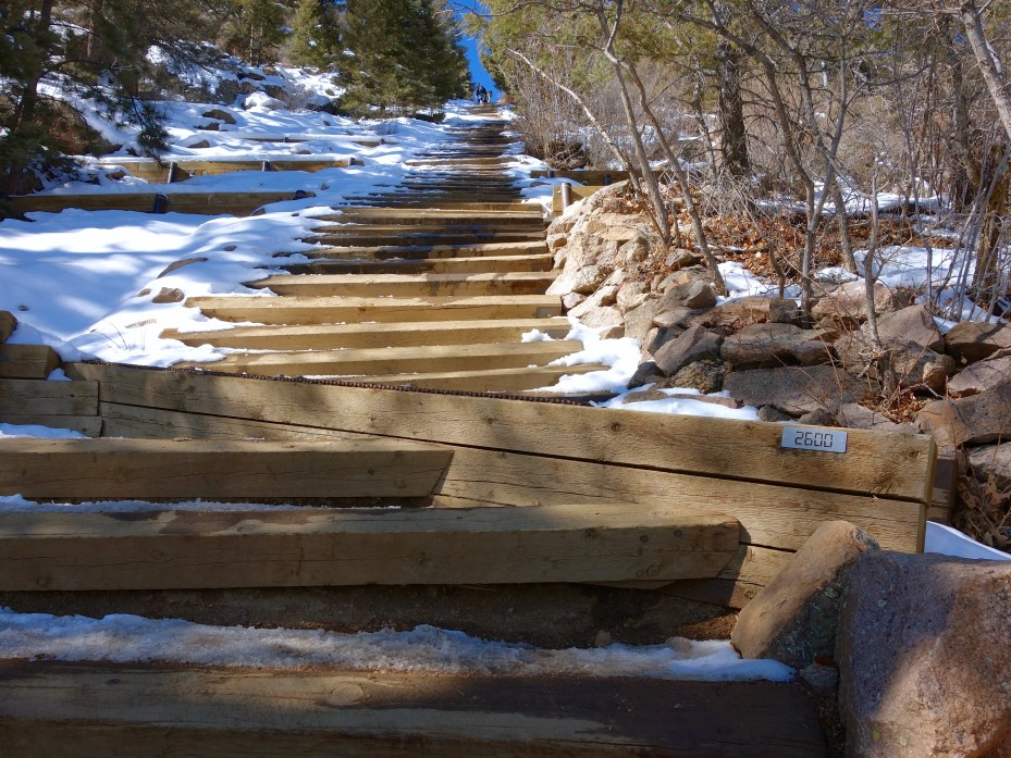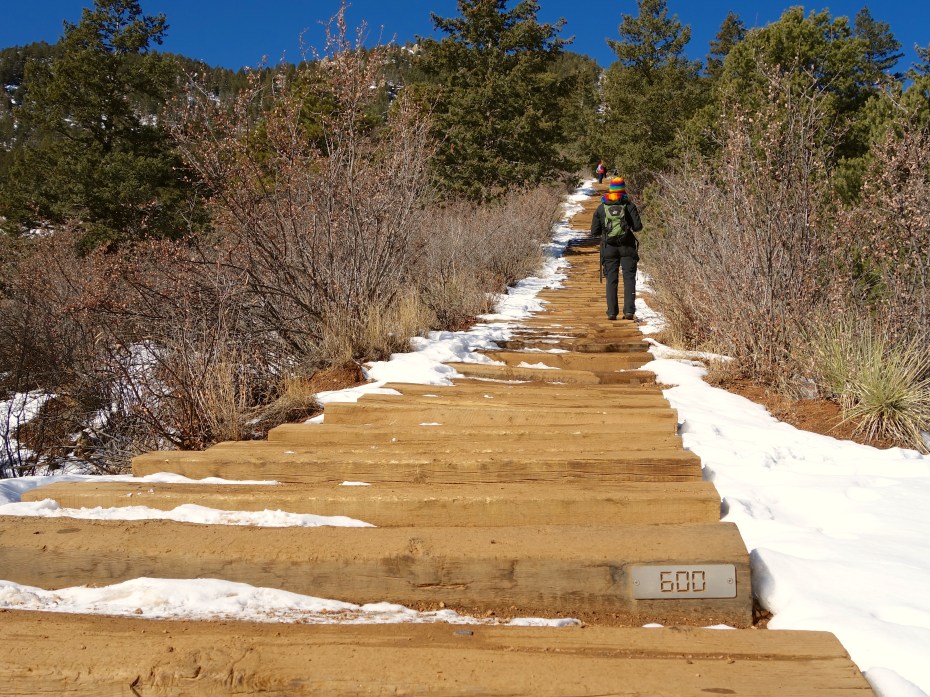 The grade is nice and gradual at first. It’s a good warm-up. Every couple hundred feet there’s a marker that tells you how many steps you’ve climbed, which is nice.