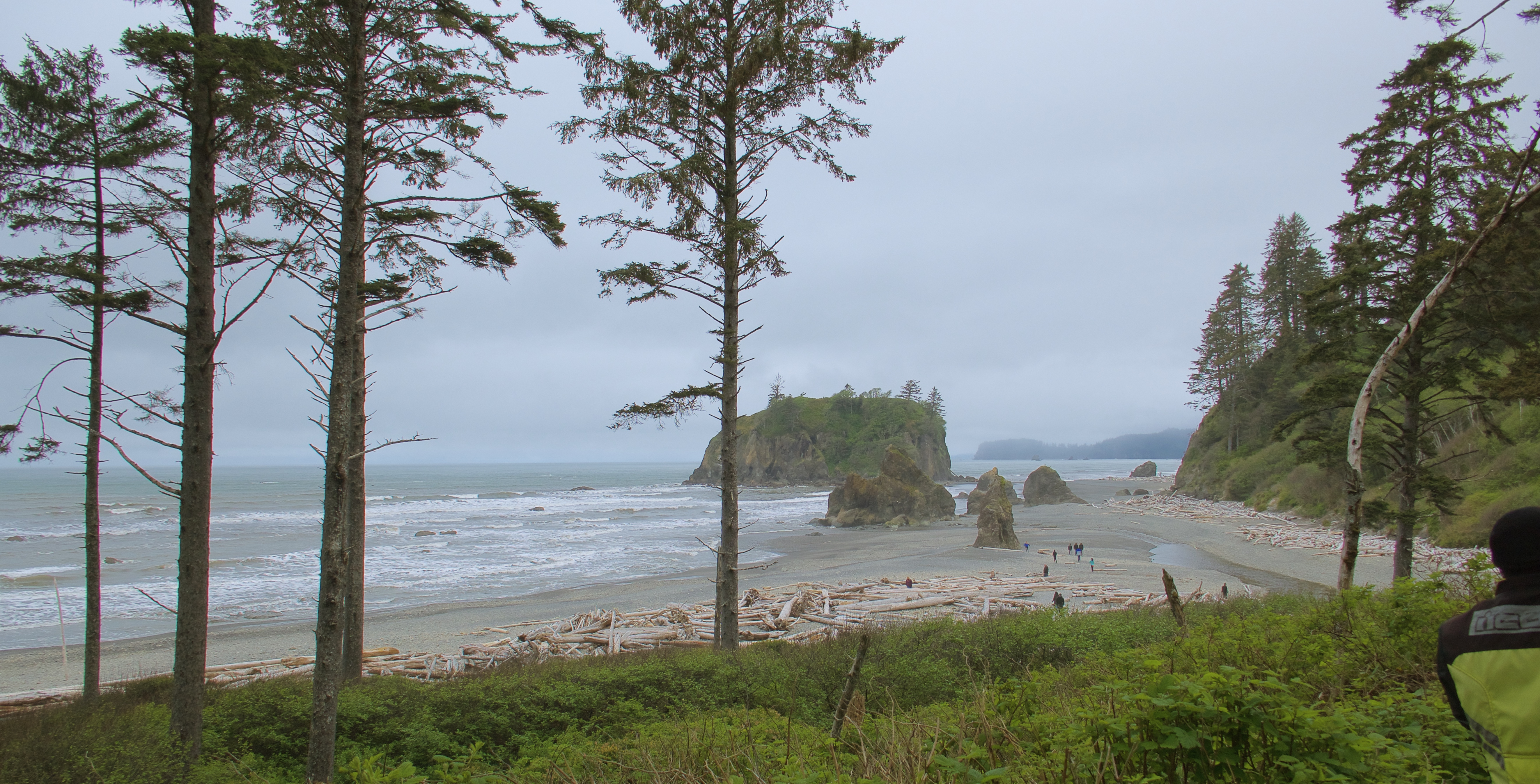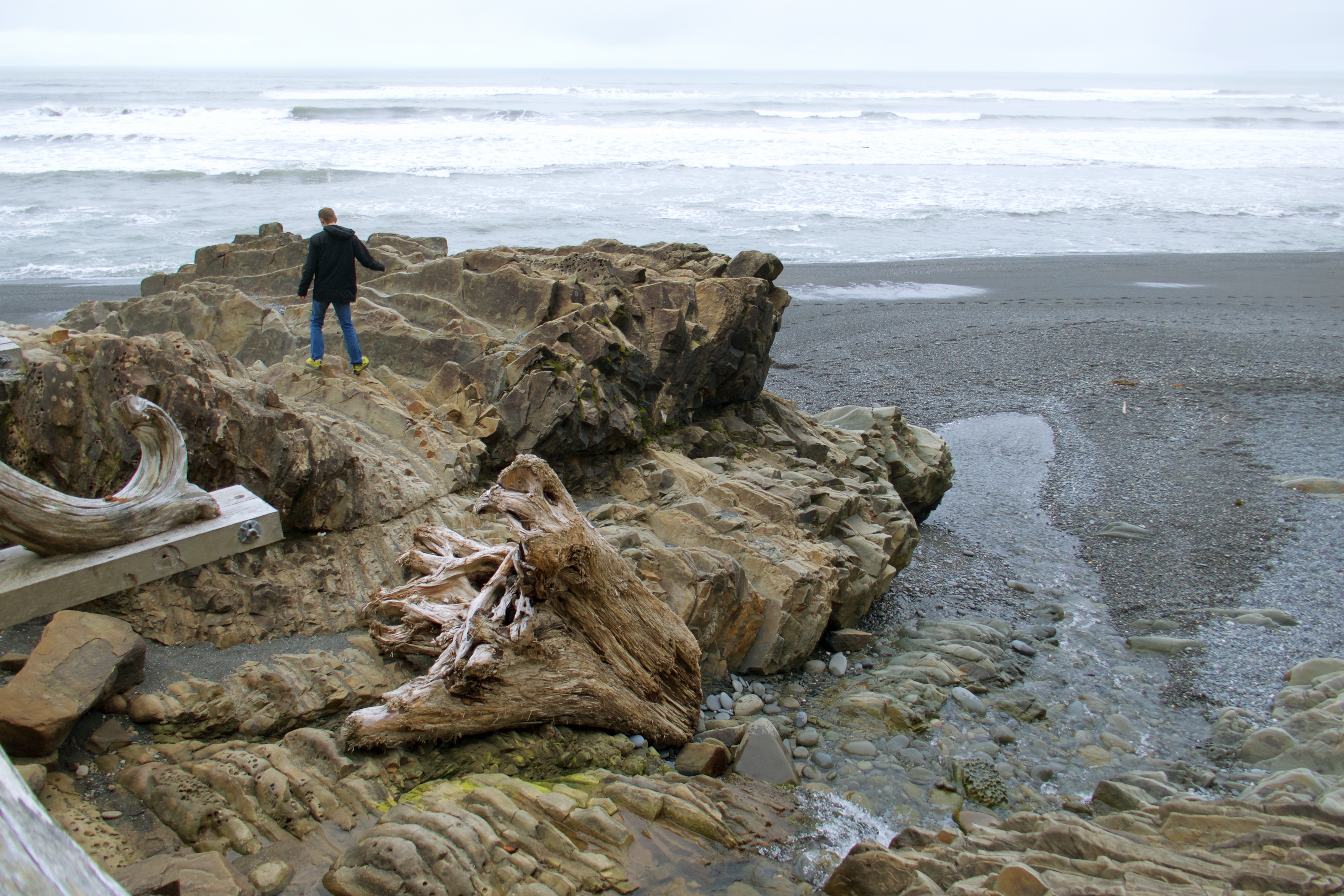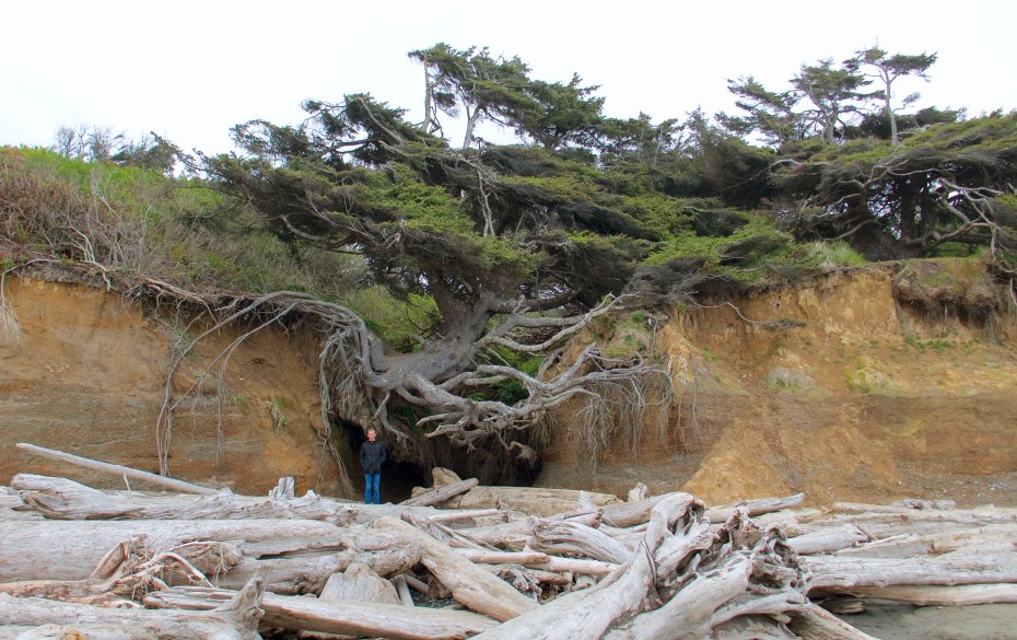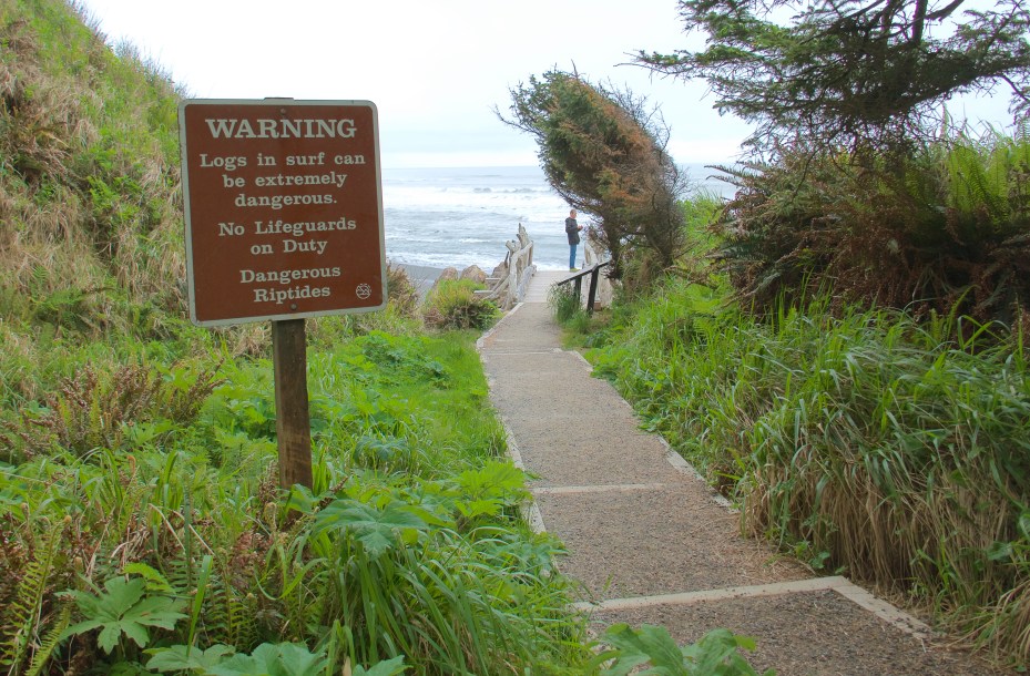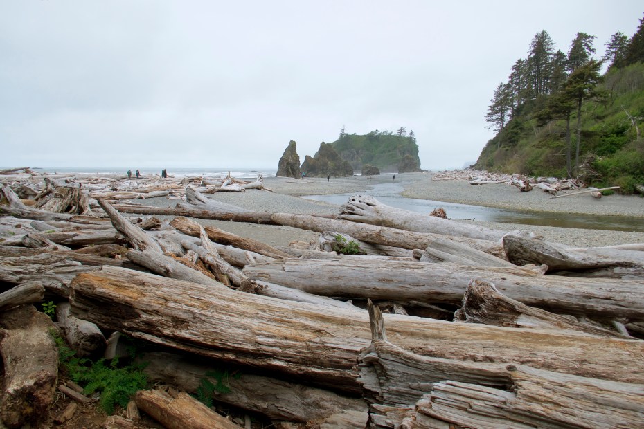 The “driftwood” here is full-size trees. There are signs on Washington beaches warning swimmers that loose logs in the surf might knock them unconscious so riptides can drag them out to sea for the rocks to shred. These beaches have no chill. (Except temperature-wise. Northern beaches are very chilly.)