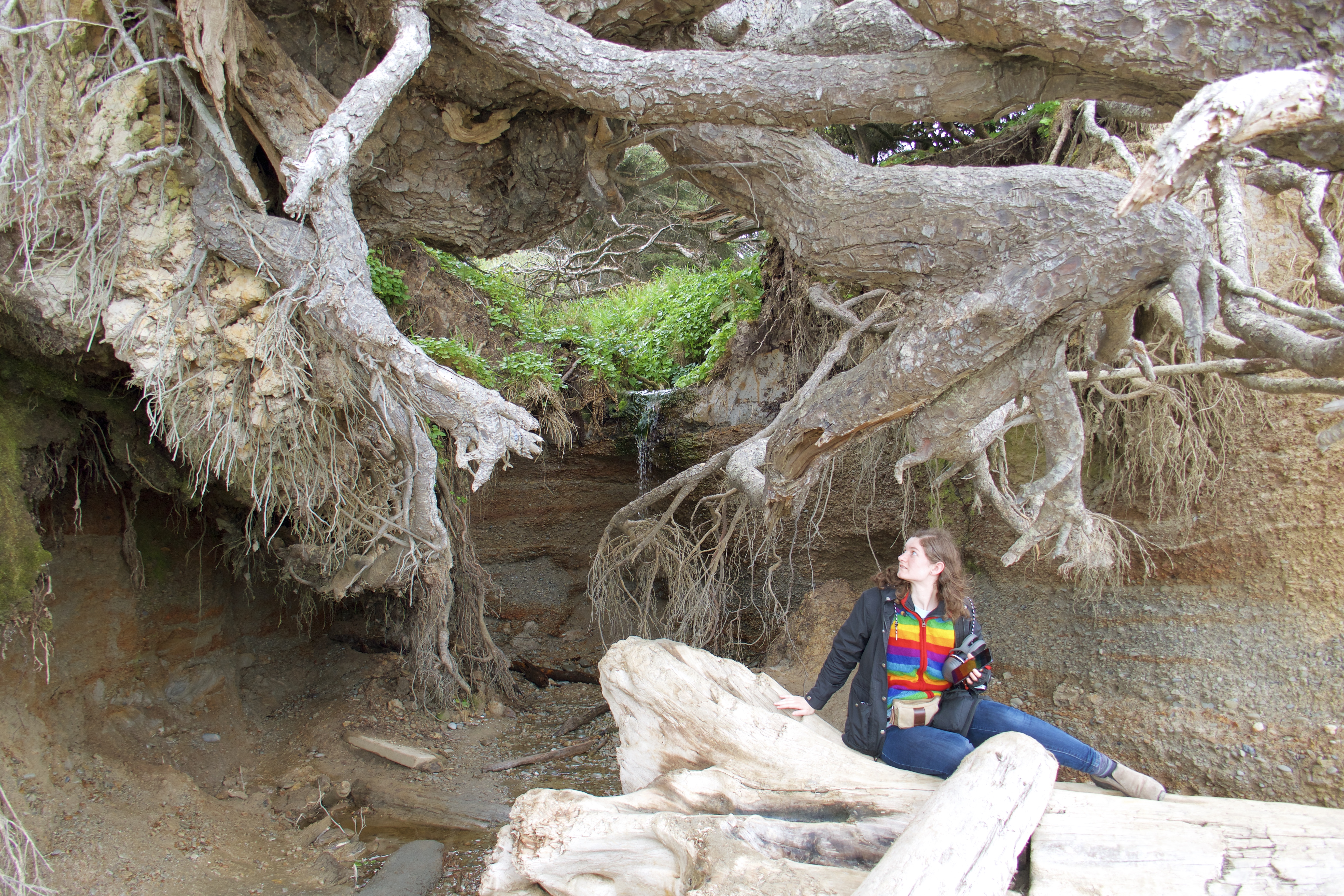 A few minutes farther down the highway there’s a tree that’s had the soil washed away from its roots by a small stream looking for the sea. It’s kind of inspiring, this tree’s determination to survive.