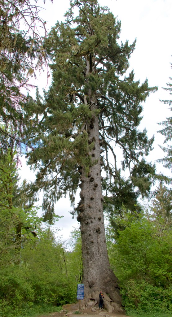 We had a really excellent meal there, and then killed some more time by going to look at the World’s Biggest Spruce Tree. It’s a massive Sitka. Elizabeth for scale: