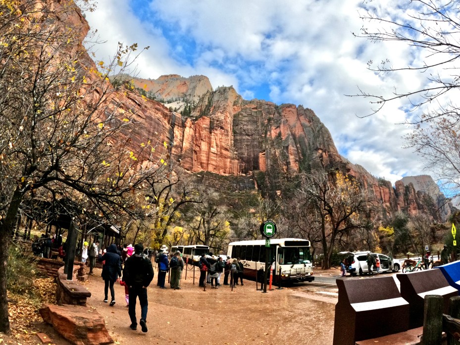 There are nine stops along the route, and you can get off and on at any of them. But by the time we boarded it was 3:30 pm, and the last bus departed from the farthest stop at 6:15. If you missed it, you had a looooooong walk back to your car. So we stayed on the shuttle all the way to the last stop, and only got off to explore the trail that runs along the Virgin River to the slot canyon known as the Narrows.