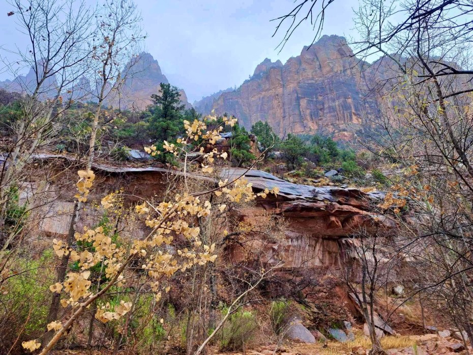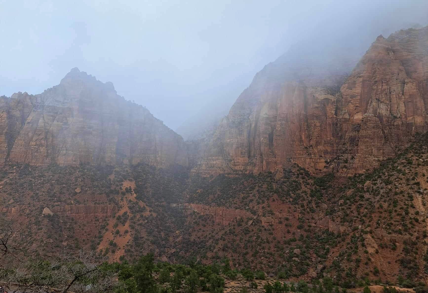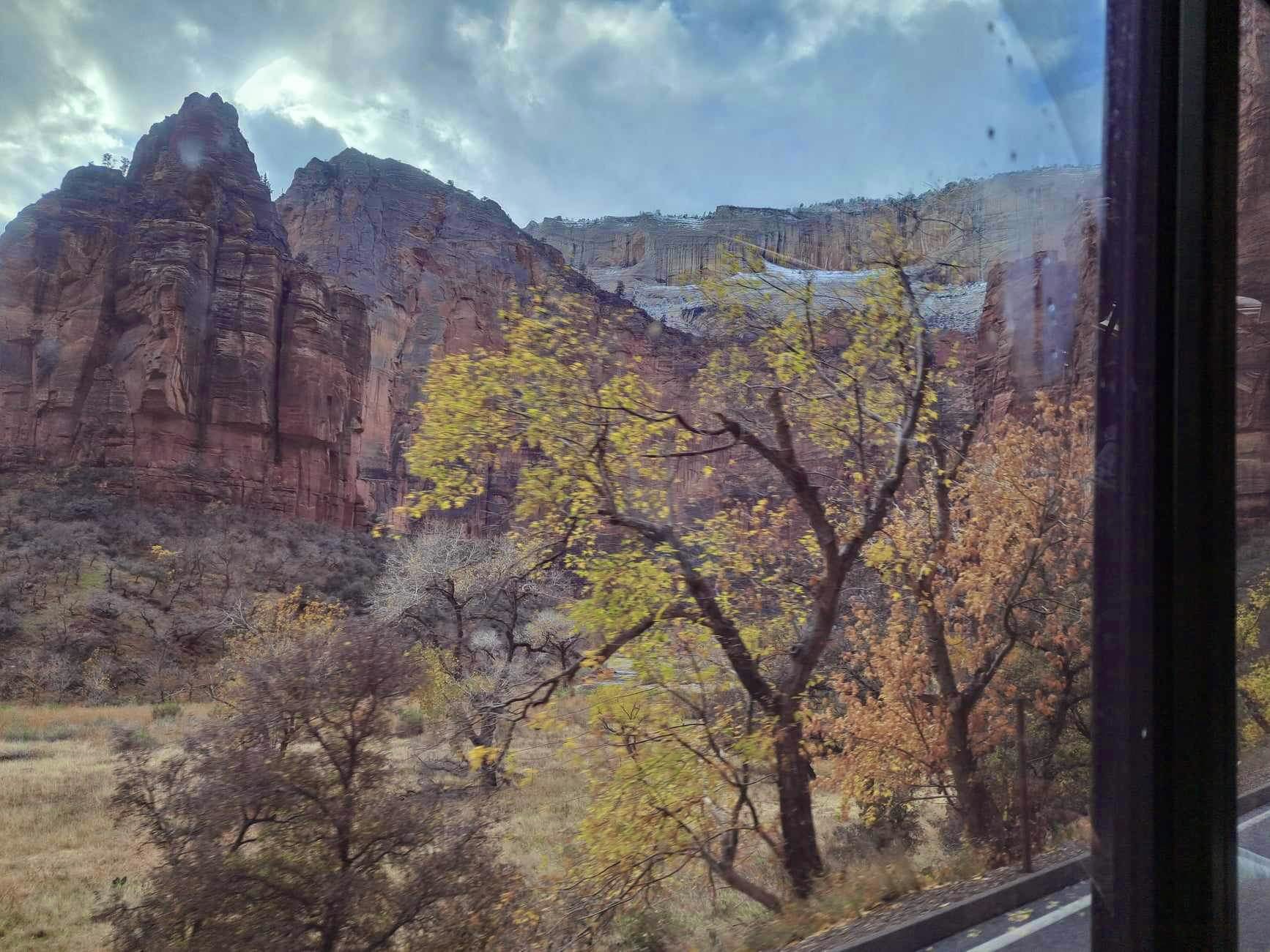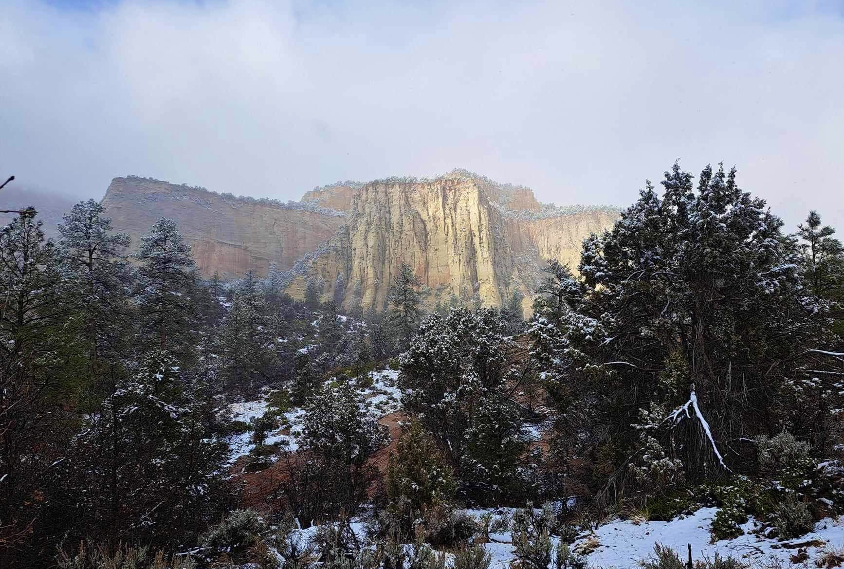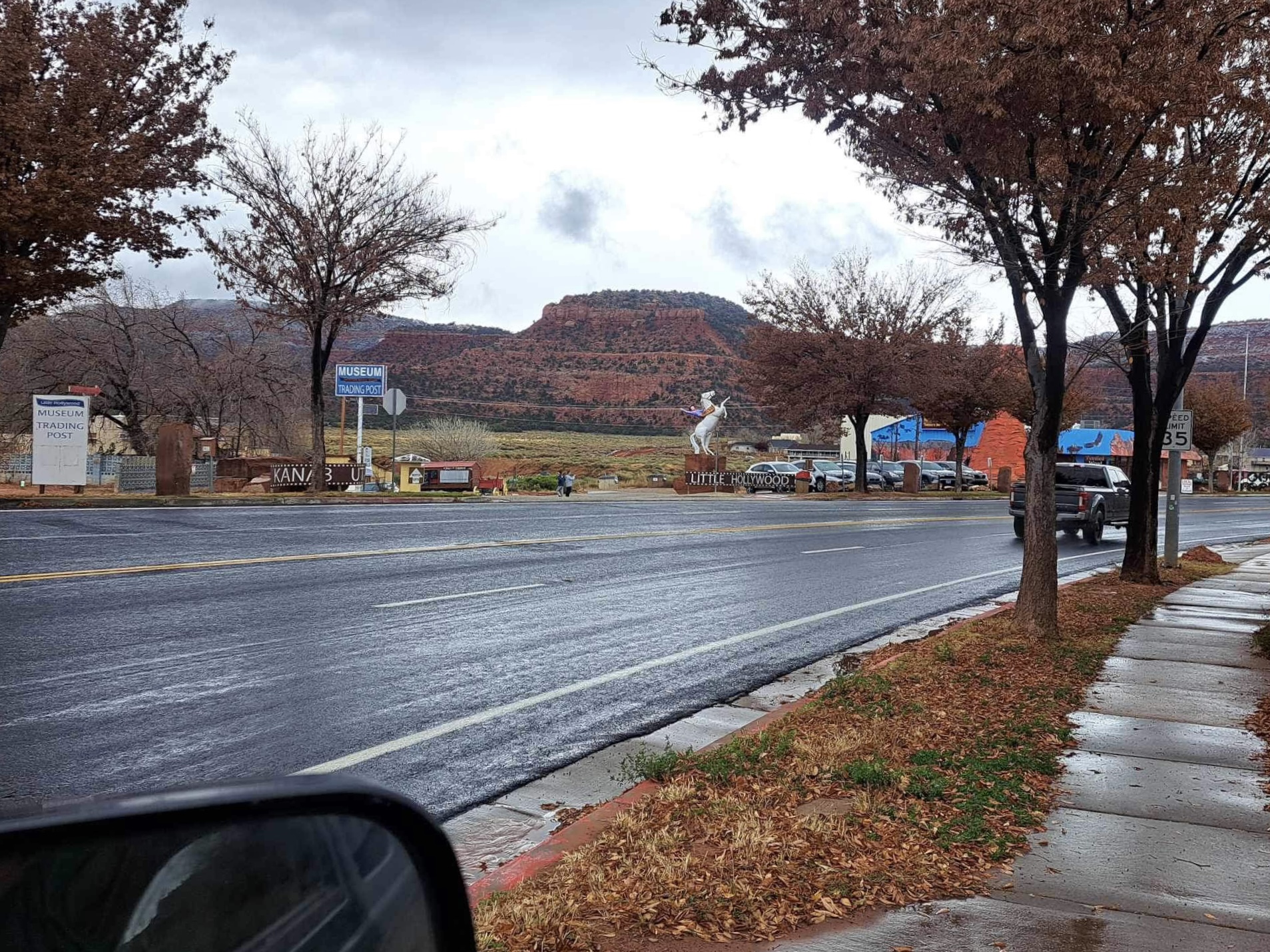 The drive from Horseshoe Bend to Zion National Park is a pretty one that passes through alien rockscapes and cute little towns. Our weather alternated between heavy overcast, drizzling rain and snow flurries.