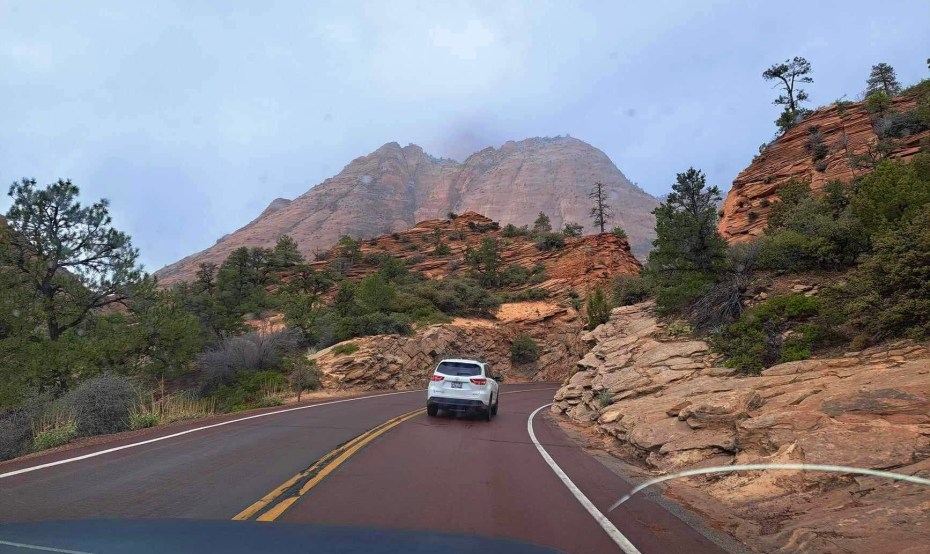 We crossed the border from Arizona into Utah a little after 11 am, and arrived at the East Entrance of Zion National park just before 1 pm. (Please ignore the nice windshield crack.)