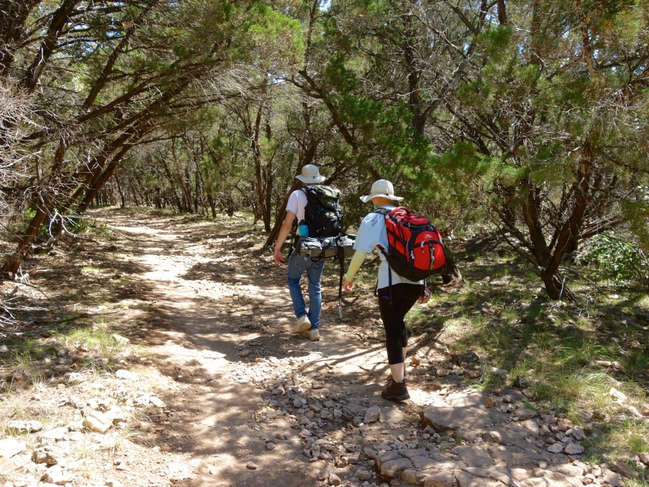 We were so tired when we arrived at Tejas Camp, I didn’t think to get any scenic shots of our tent. There was still plenty of daylight, but we just filled our flasks at the community spigot, set up the tent and collapsed. We really need better-quality sleeping pads. We do have a nice comfy self-inflating queen size pad, but it’s so bulky and heavy we didn’t attempt to bring it on this trip. Our cheap starter pads are…yeah. We got what we paid for.