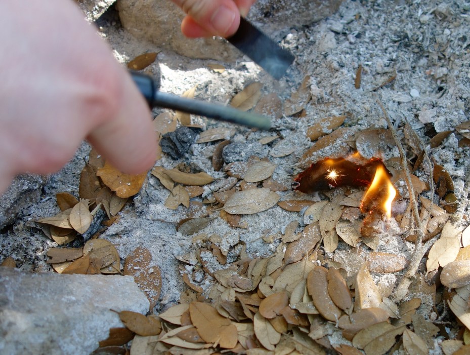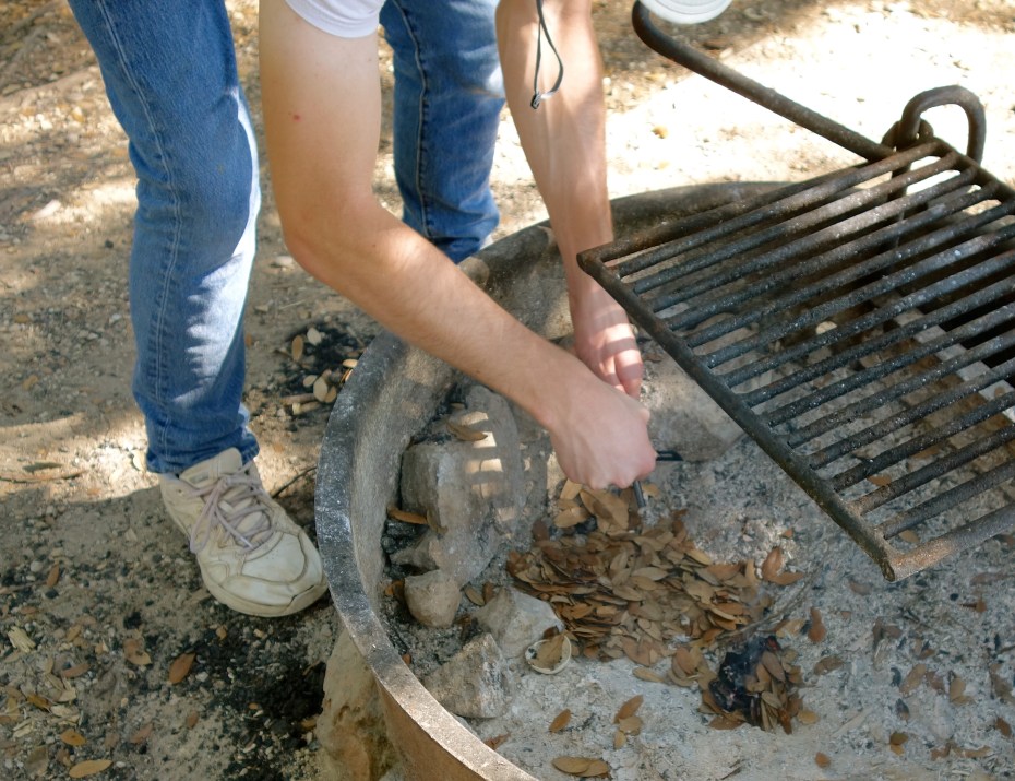 Before we broke camp, we tested out our shiny new ferro rods. It took a little practice, but eventually we each struck up a small fire in the fire pit.