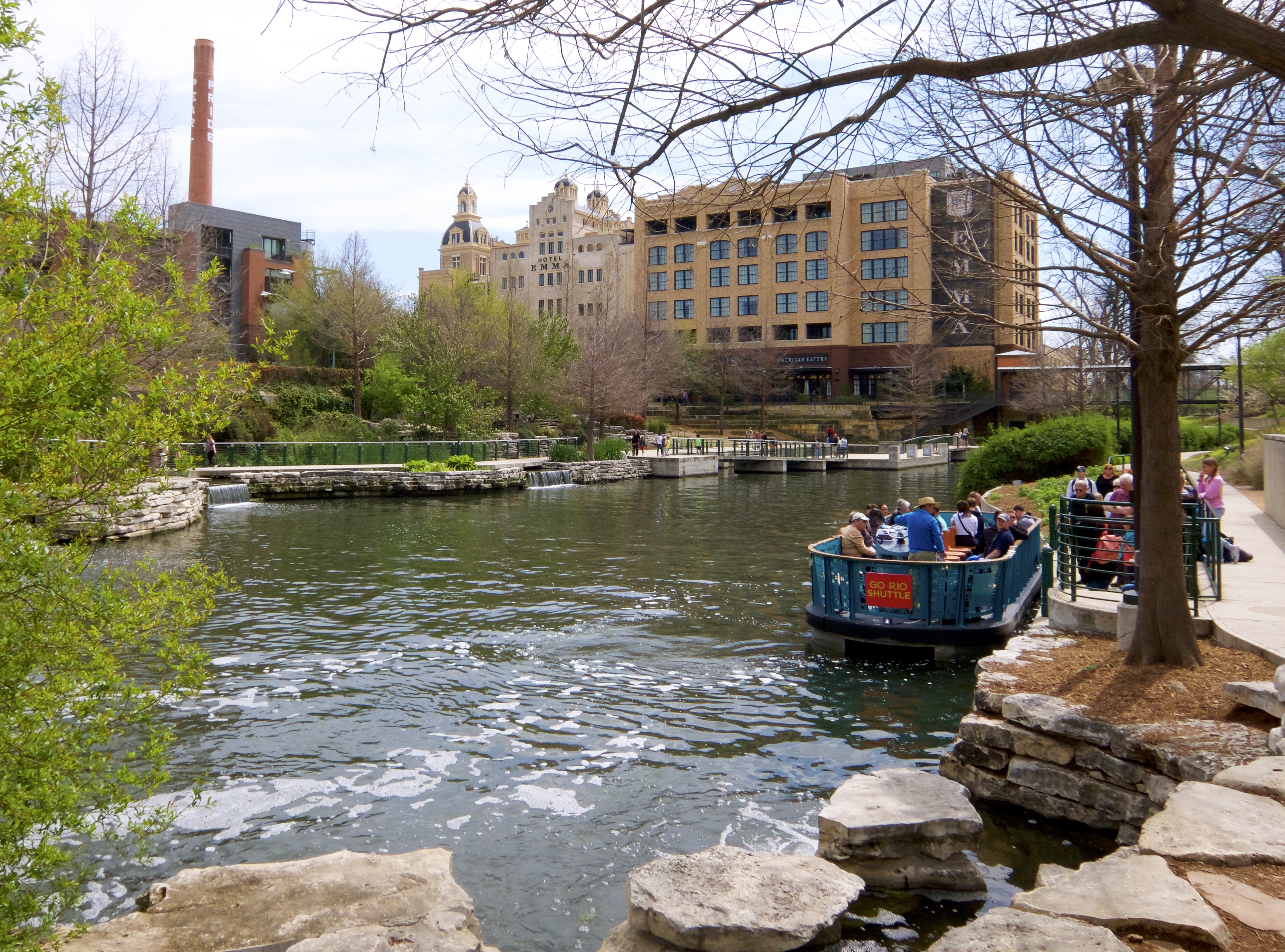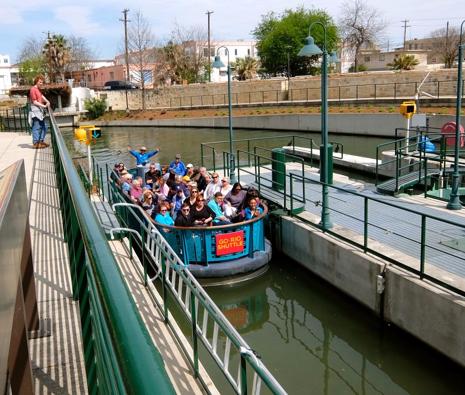 A river shuttle carries passengers back and forth between the Pearl and the downstream end of the Riverwalk, about five miles each way.