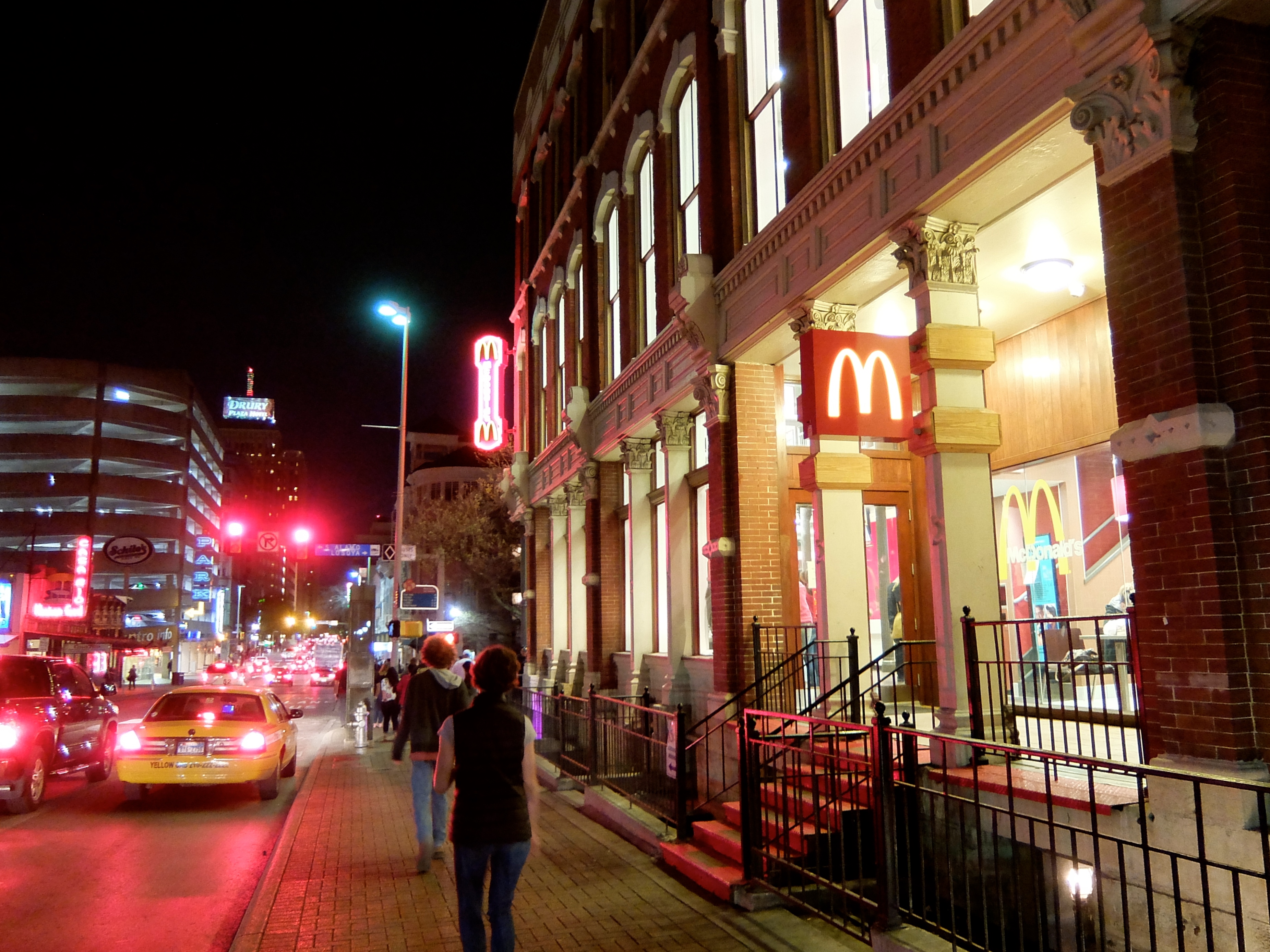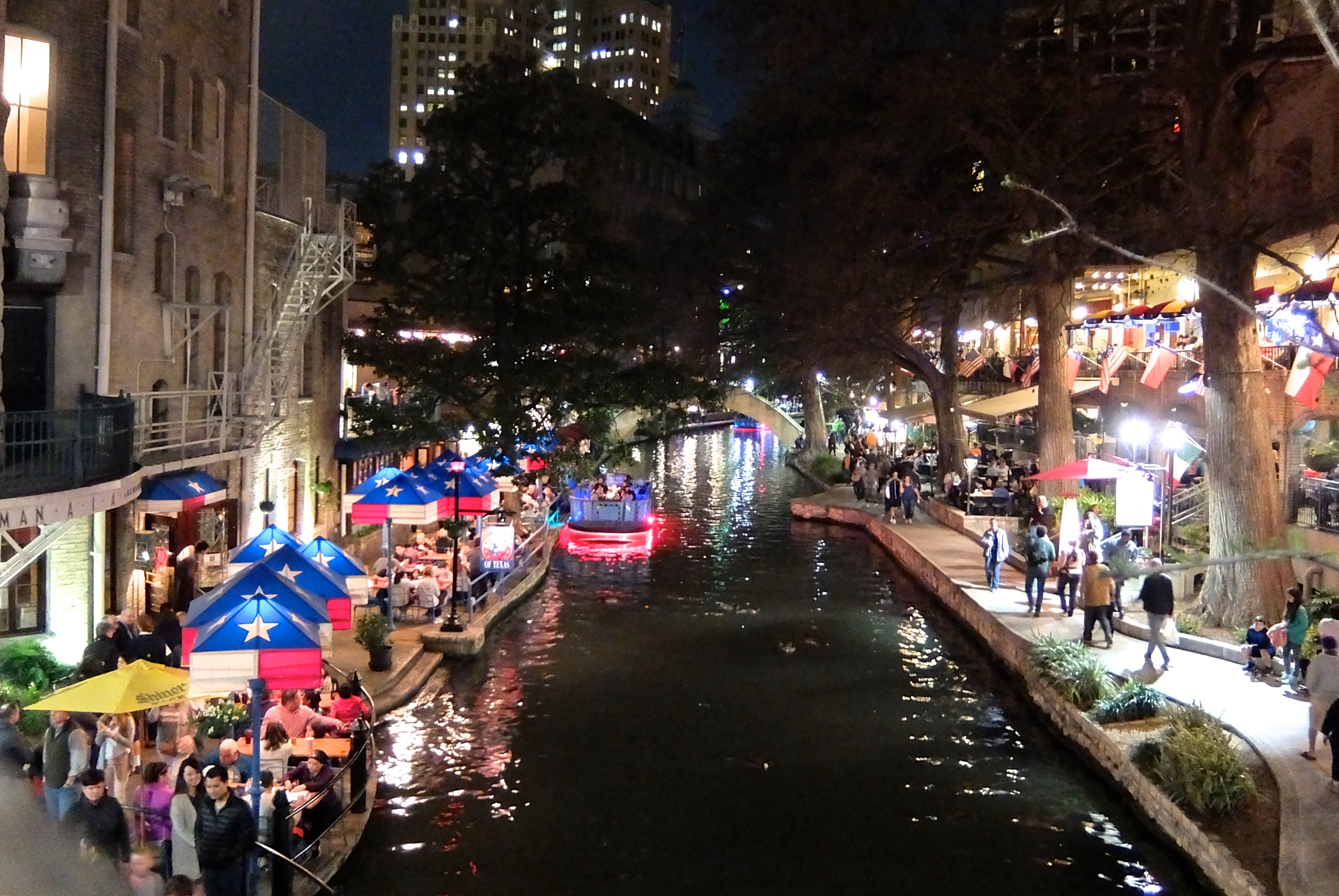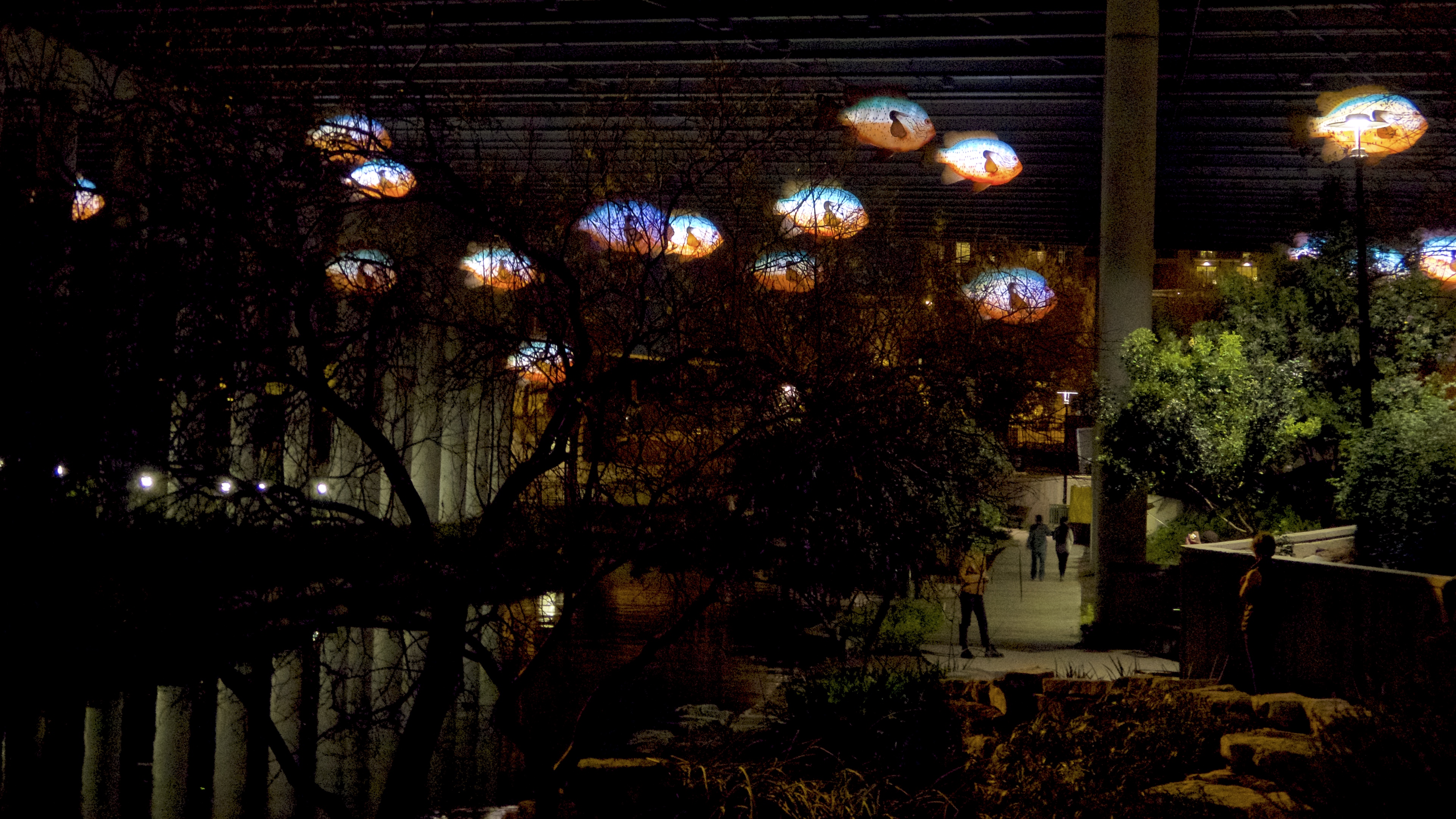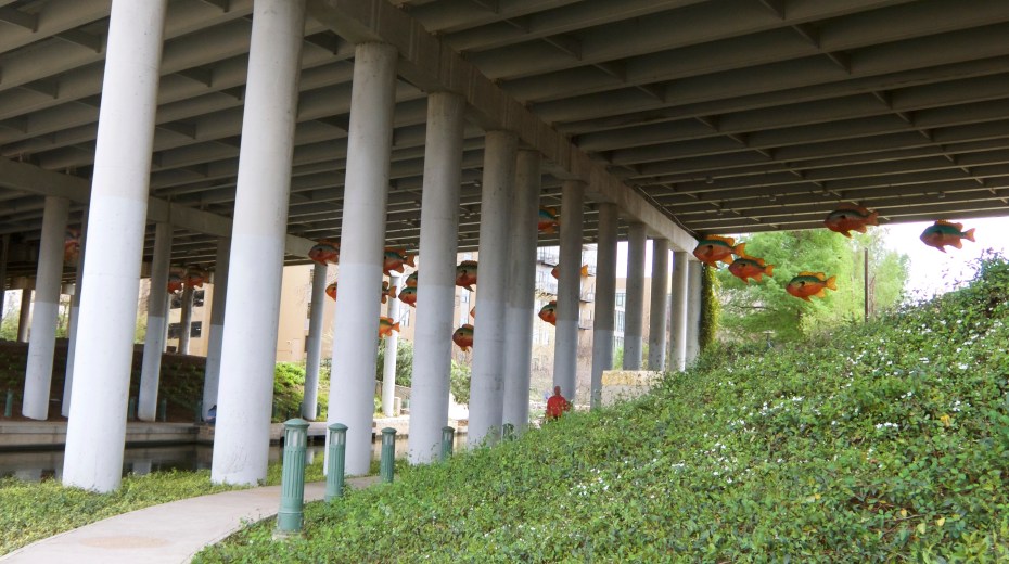 We were ready to catch a rio shuttle back to the Pearl, but alas, we just missed the last boat. We decided to walk back to the car on surface streets to shave off some distance. But we wanted to see the illuminated fish, so we cut back to the Riverwalk just before the I-35 underpass.