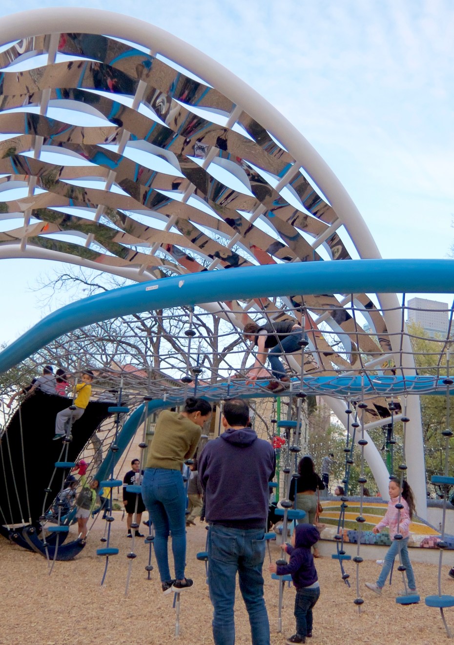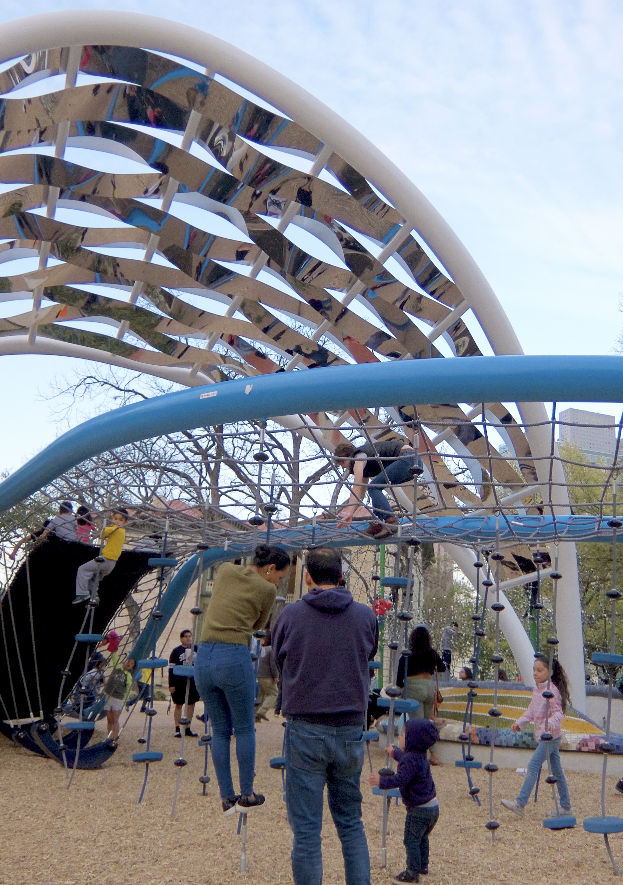We had timed our visit to the Tower to coincide with sunset, because I had wanted to see the city in daylight and Luke had wanted to see it at night. We got through the lines a bit earlier than we had expected, so after I got my daylight views we came back down and killed some time in the park. There is a nice play area there with lots of climby stuff.