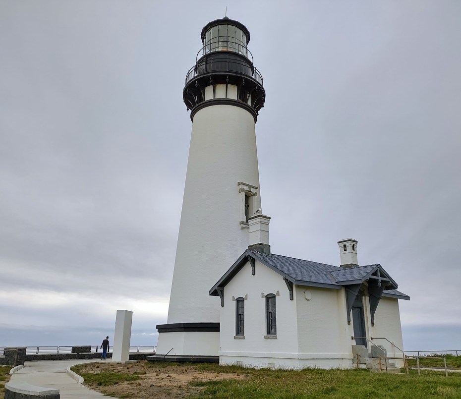 Eleven lighthouses stand guard along Oregon’s rocky coast. We stopped just north of Newport to see the tallest of them, on Yaquina Head. There’s a little fee station at the top of the road where you’re supposed to pay for day use, but it had closed for the day and the entry gate was locked. We parked on the side of the driveway and walked the mile or so to the lighthouse.