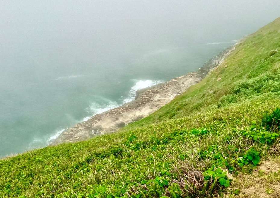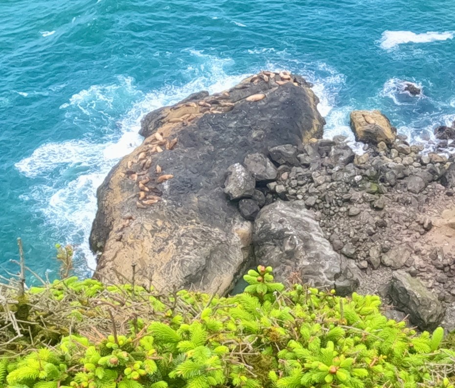 A little farther down the coast we pulled onto an overlook that offers another scenic view of Heceta Head. And here we saw sea lions sunning on a rock just below the turnout. This was the first time I really missed my camera with its lovely zoom lens. The GoPro failed miserably at capturing both the sea lions and the lighthouse in the distance.