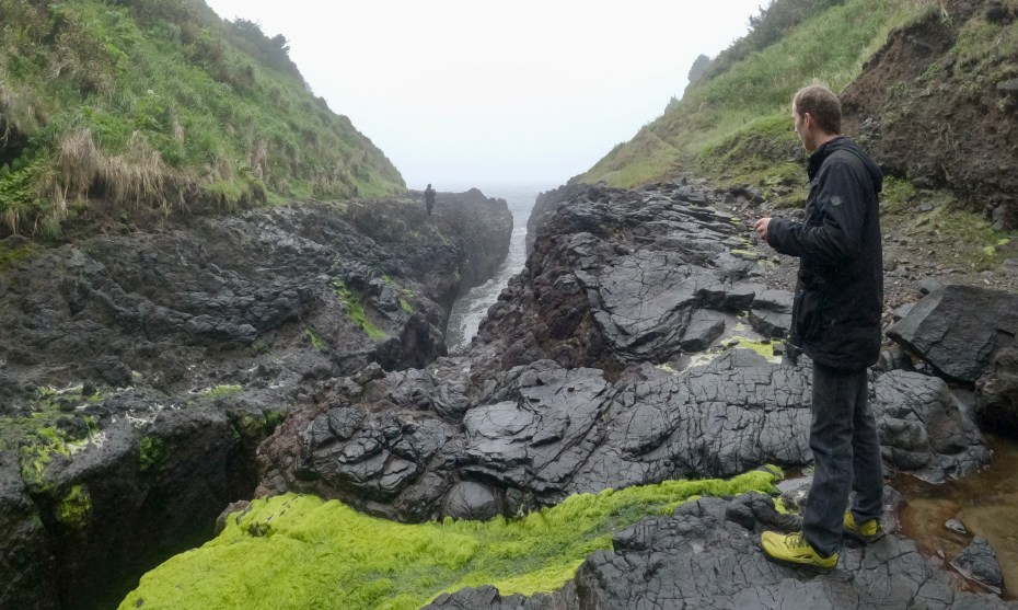 The Devil’s Churn is hard to describe, and I wish I’d taken a video of it. It’s a narrow channel carved by a stream joining the sea. Waves roll into it and back out, so it’s nearly empty one minute and overflowing the next. From the highway it looks almost serene: