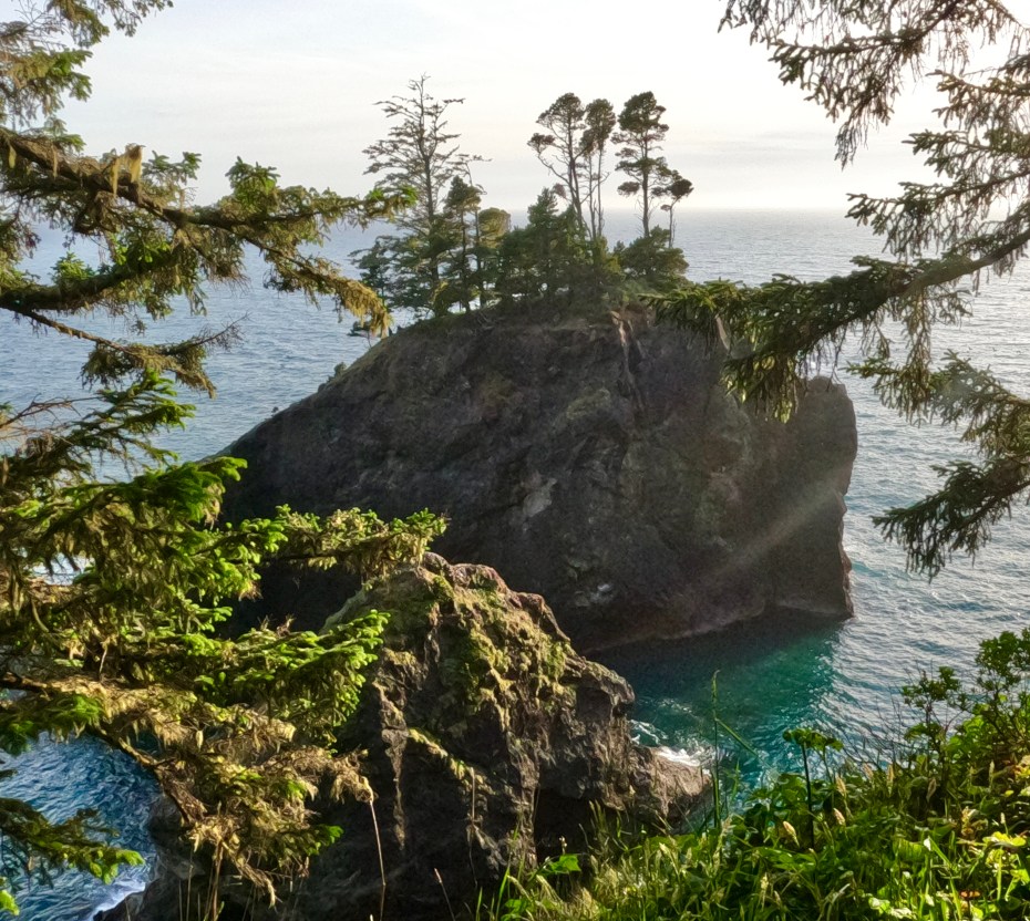 Just north of Brookings we came upon a place of otherworldly beauty. A place where tall trees thrive on seemingly bare rock, where the land thrusts stony fingers into the sea and the sea cuts round culverts through them.