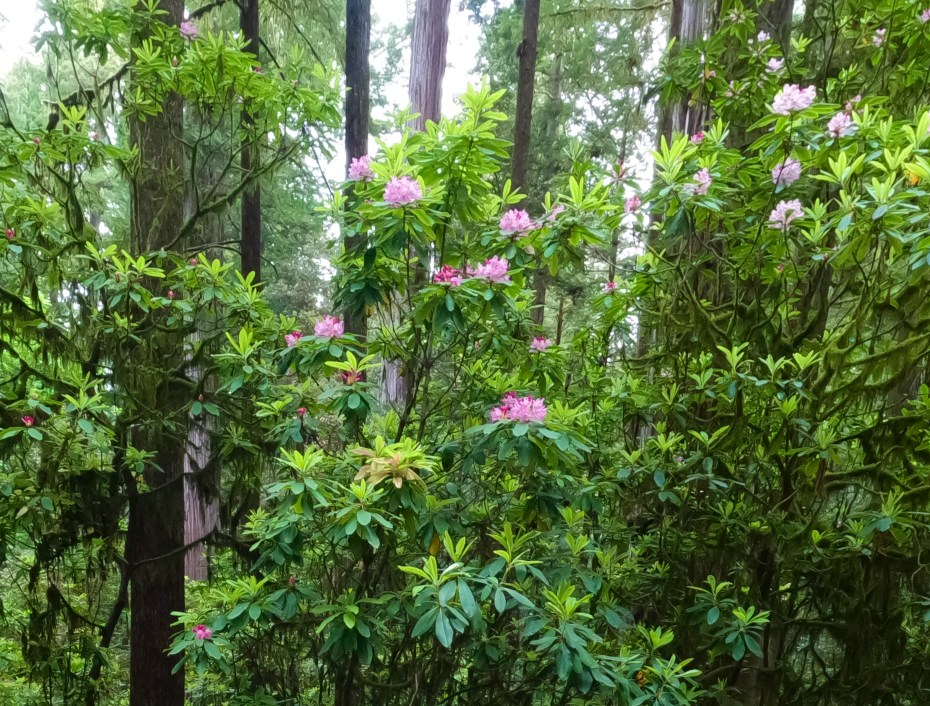 Wild spring rhododendrons bloomed profusely in the shaded woods.