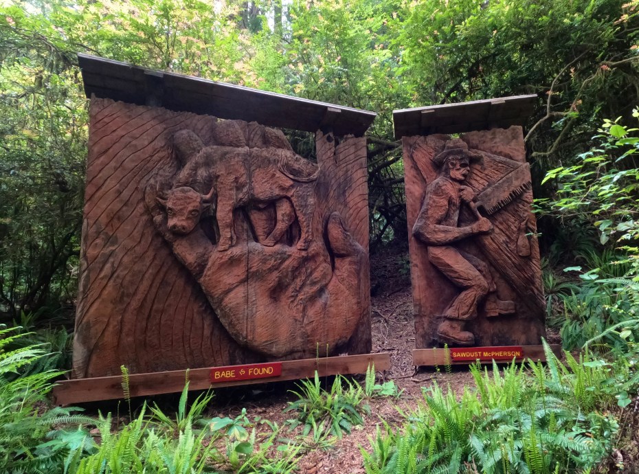 Lots of wood and metal depictions of events and characters from the Paul Bunyan legends.