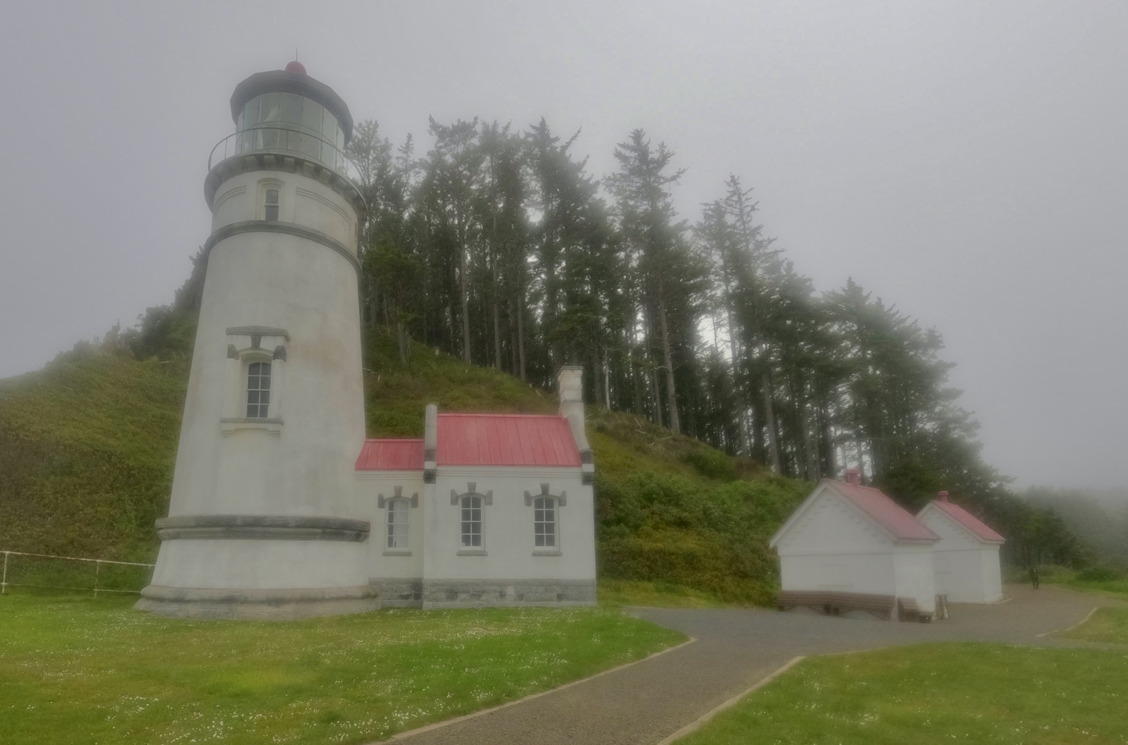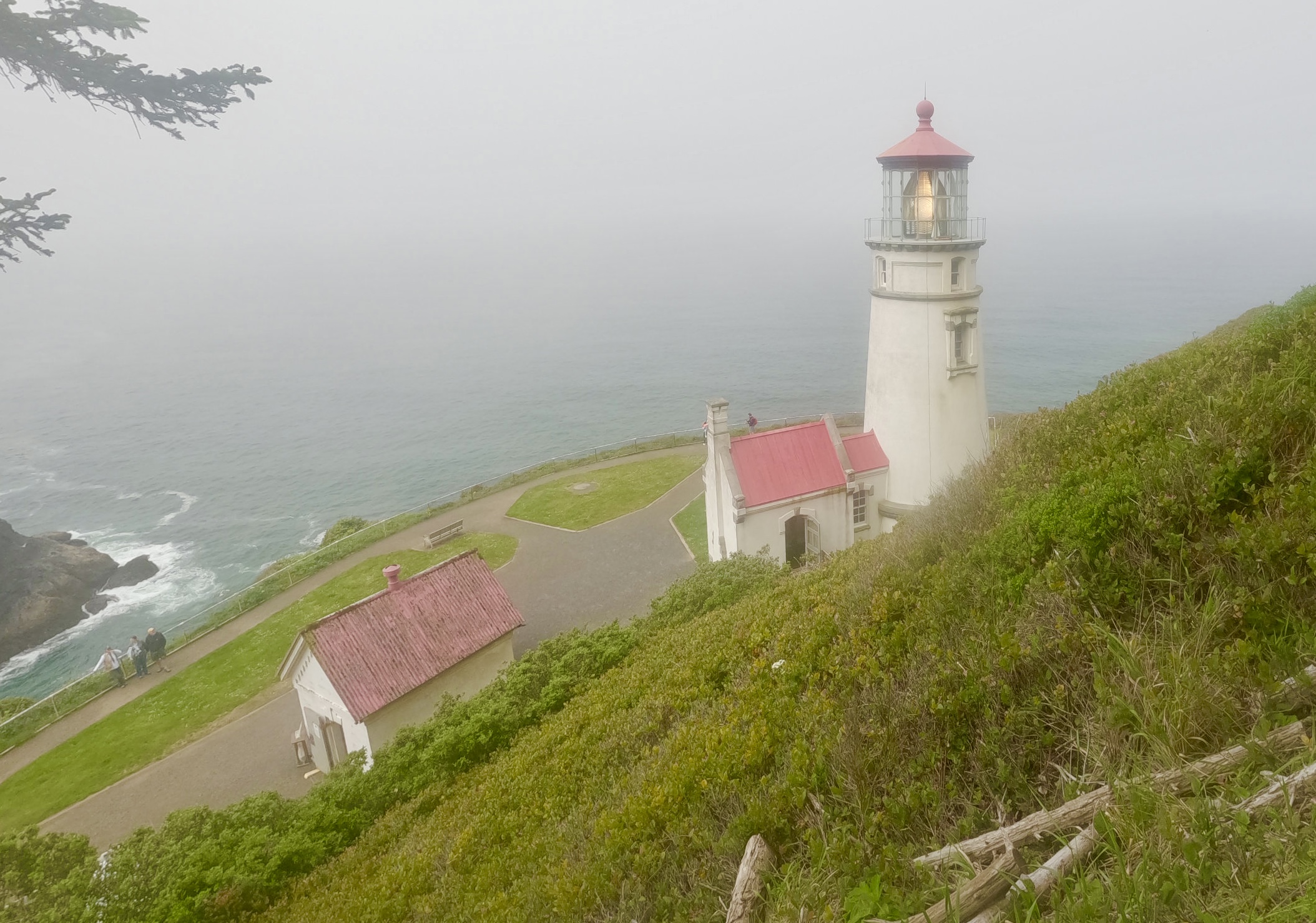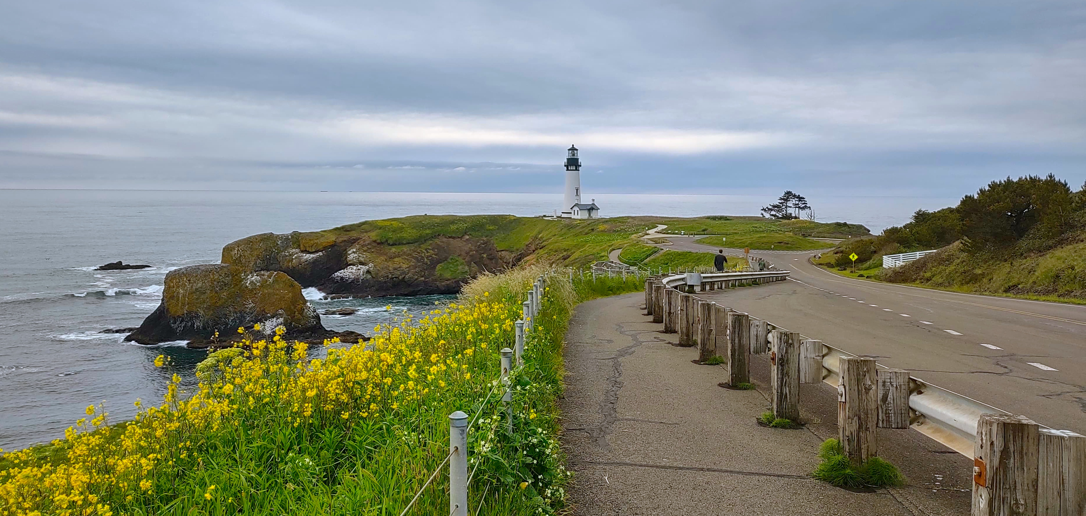 Eleven lighthouses stand guard along Oregon’s rocky coast. We stopped just north of Newport to see the tallest of them, on Yaquina Head. There’s a little fee station at the top of the road where you’re supposed to pay for day use, but it had closed for the day and the entry gate was locked. We parked on the side of the driveway and walked the mile or so to the lighthouse.