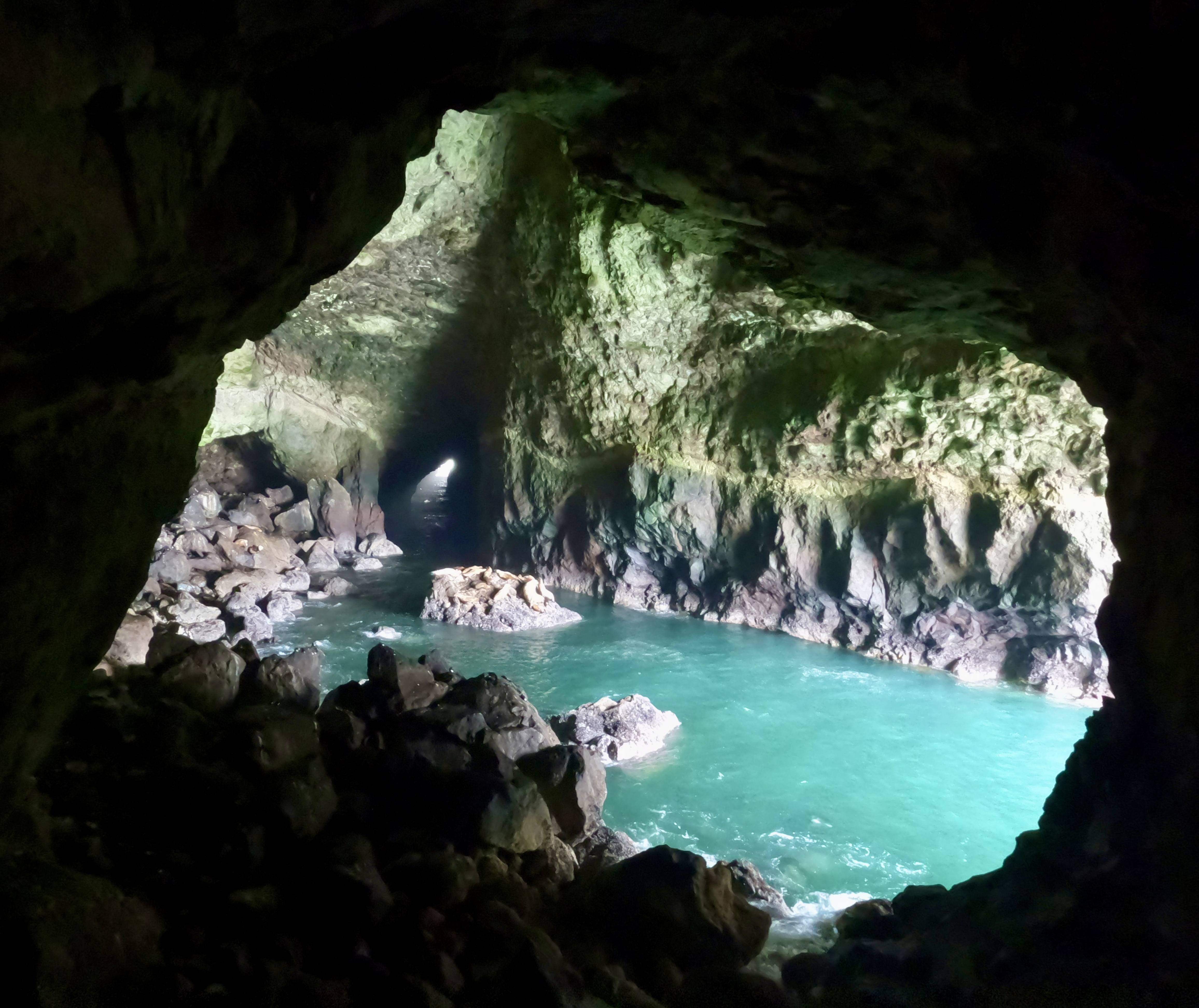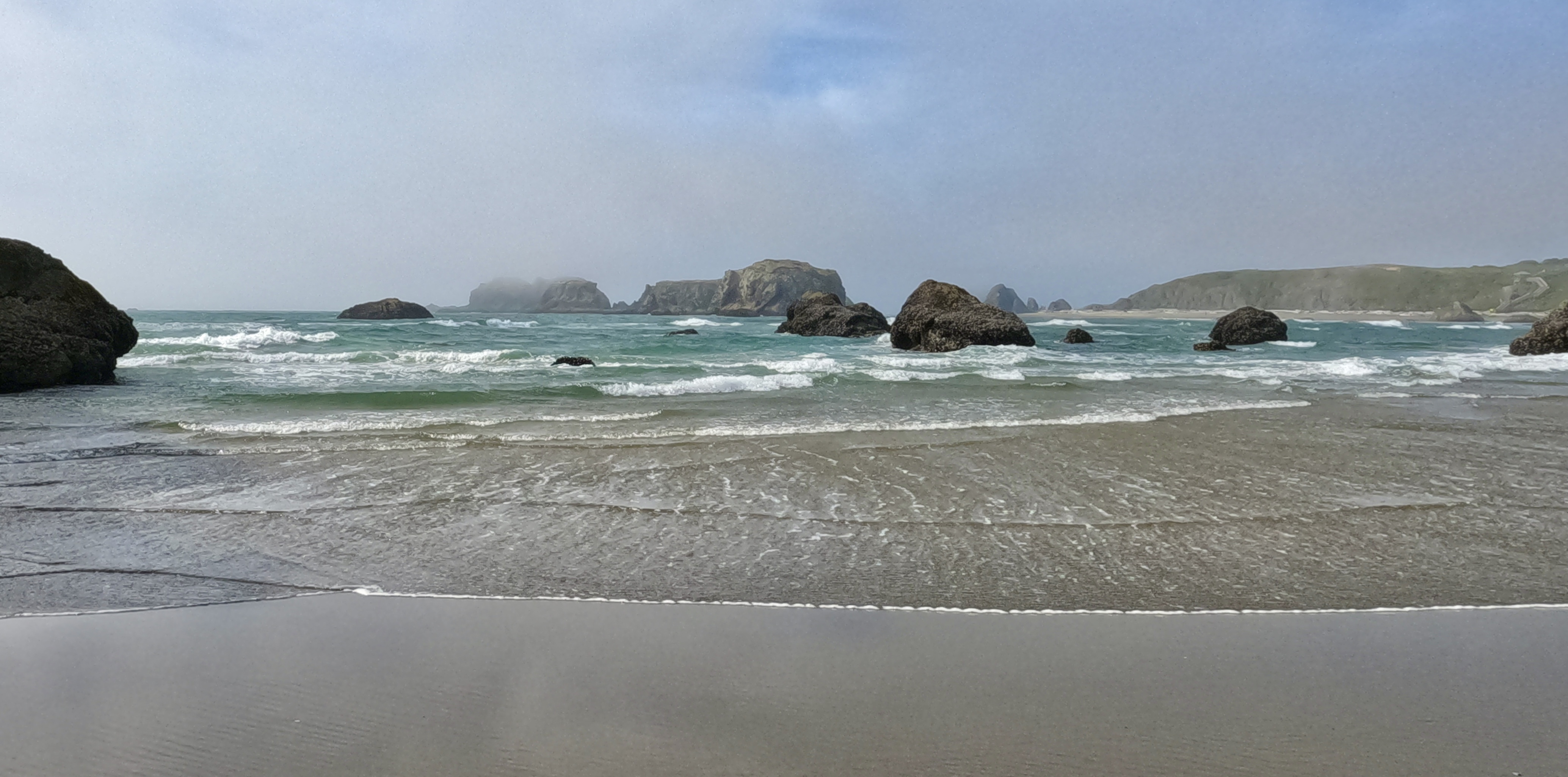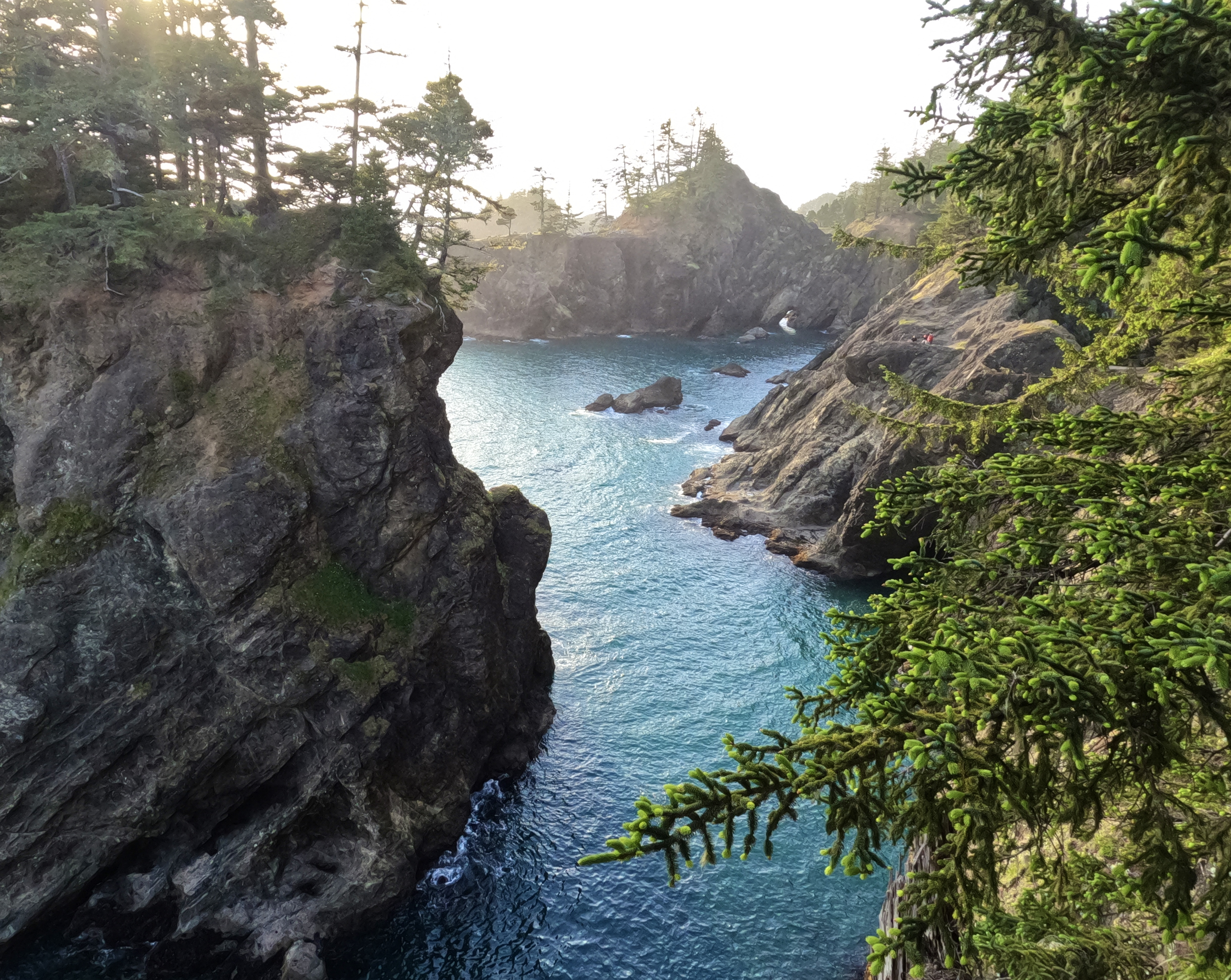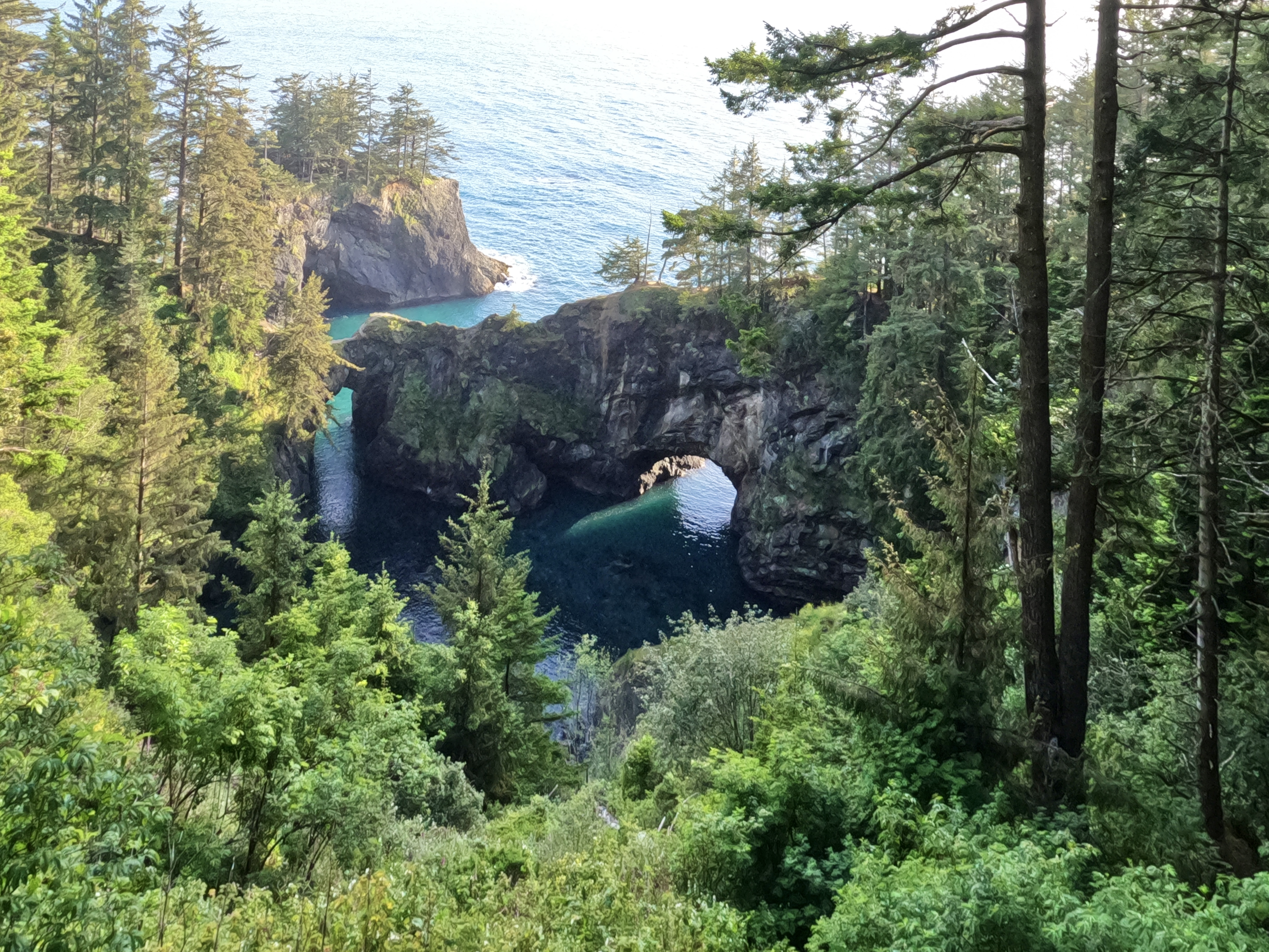 Just north of Brookings we came upon a place of otherworldly beauty. A place where tall trees thrive on seemingly bare rock, where the land thrusts stony fingers into the sea and the sea cuts round culverts through them.