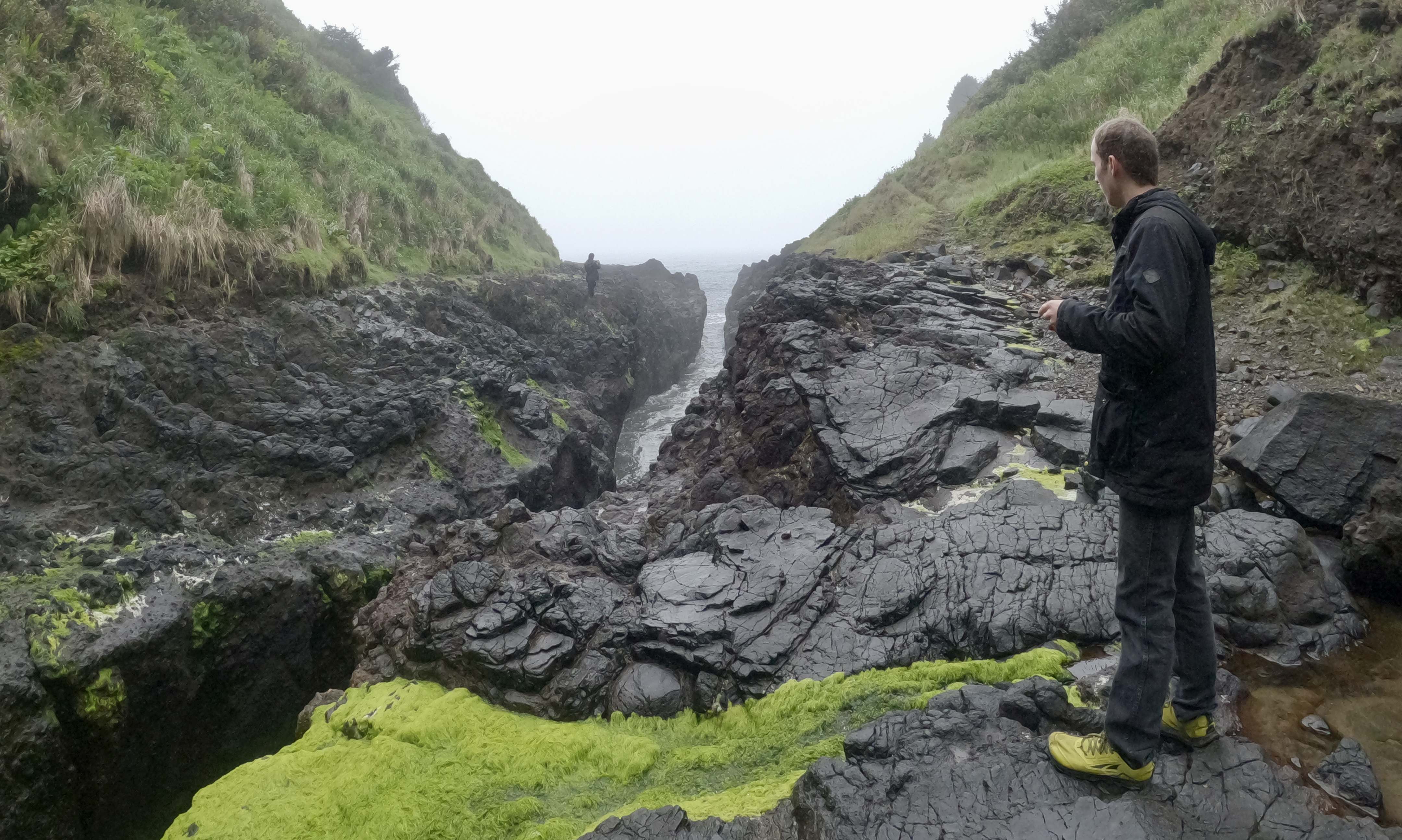 The Devil’s Churn is hard to describe, and I wish I’d taken a video of it. It’s a narrow channel carved by a stream joining the sea. Waves roll into it and back out, so it’s nearly empty one minute and overflowing the next. From the highway it looks almost serene: