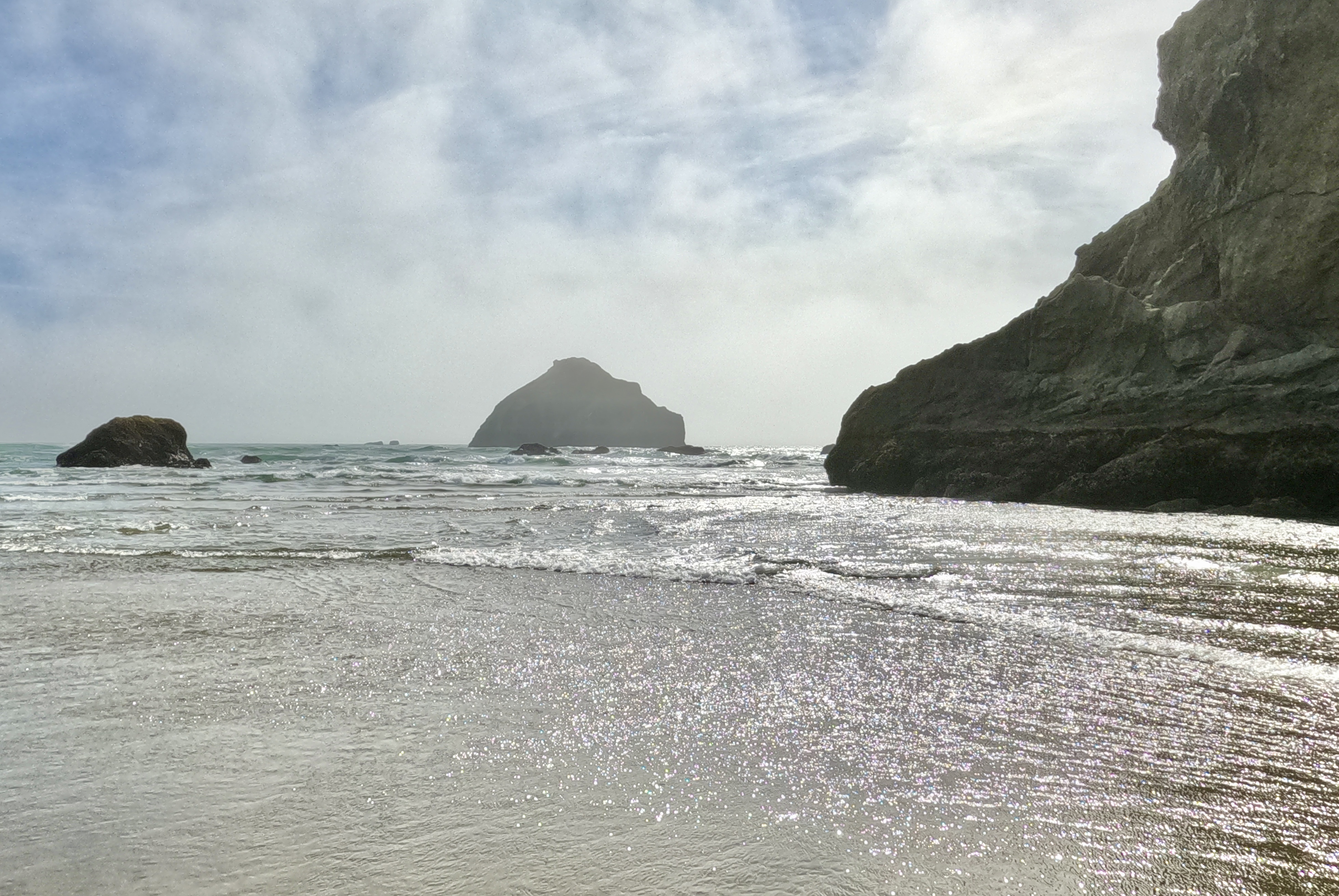 And here is my second-favorite rock on this beach, the shattered one in front that looks like a wizard’s hat or a crescent moon. I wonder what happened to the rest of it.