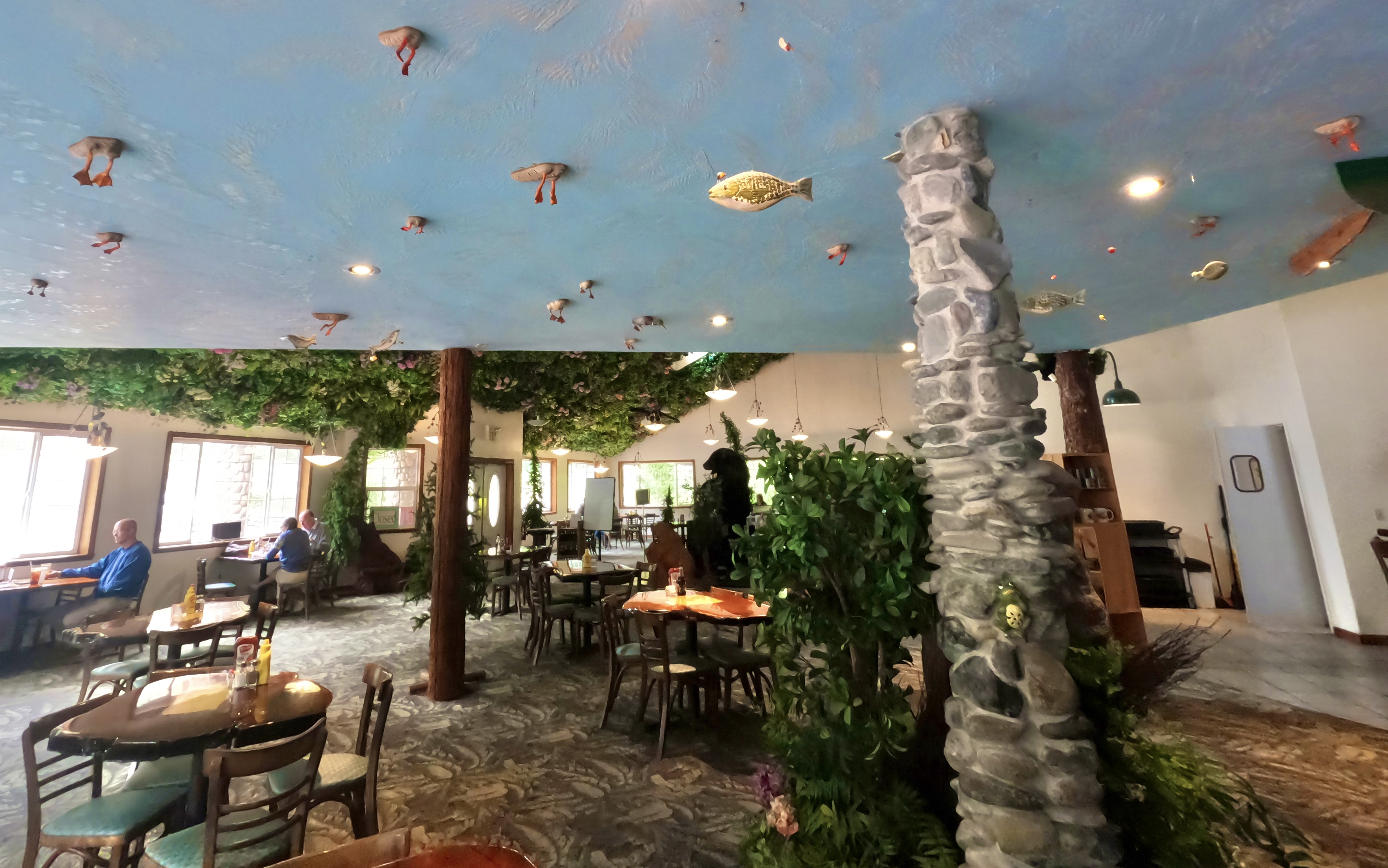 Directly across the highway from Trees of Mystery sits the Forest Cafe, a whimsical little restaurant with a woodland theme. Our seating area had been arranged to create the illusion of being at the bottom of a pond.