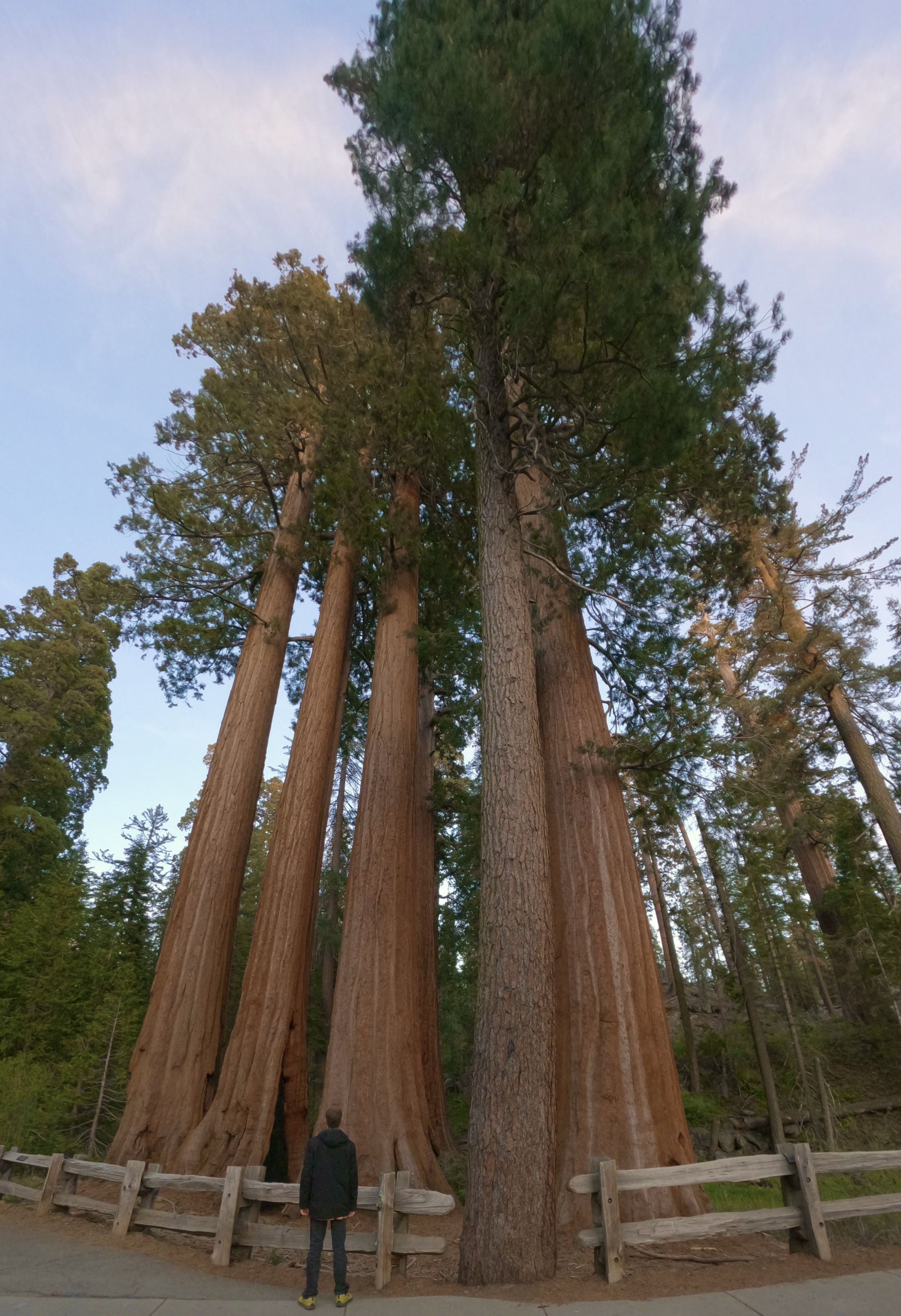 Unlike the coastal forests, the sequoias seem to avoid touching one another at all. They are not as tall as the coastal redwoods, but their thicker bases make them larger by volume. The redwood trunks are straight poles, the sequoia trunks taper as they go up.